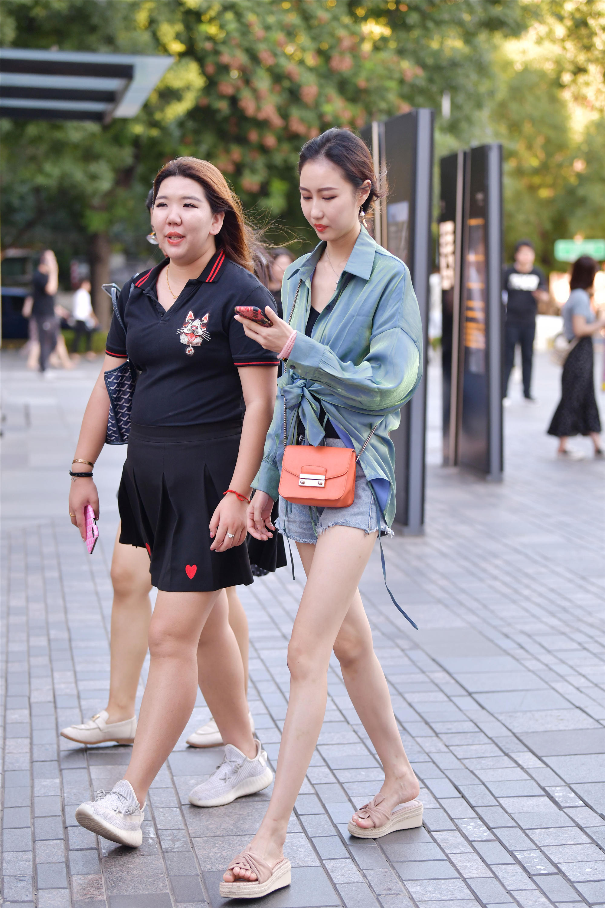 如果想搭配,不要在意自己身材,而是要想着如何穿出自己的时尚效果,这一对闺蜜,一位身材骨感,一位身材很胖,但是她们依旧是好闺蜜,依旧可以各自搭配出自己的味道来,骨感姑娘穿着短裤搭配一件亮色外套,脚下一双拖鞋,简单秀出骨感身材,她的闺蜜是深蓝色T恤搭配黑色百褶裙,脚下一双运动鞋,简单的服装,有着一点休闲运动风,很好看。