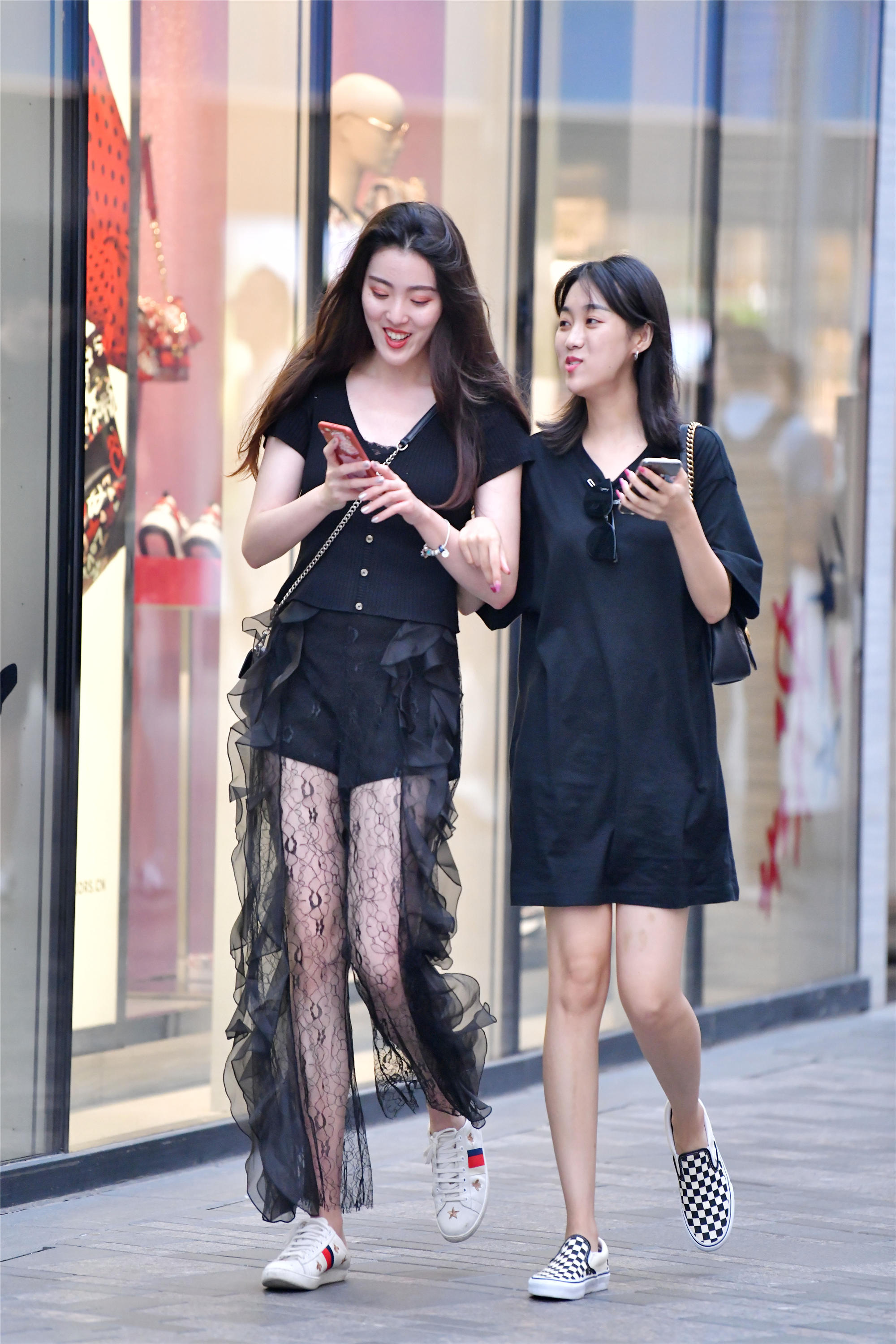 闺蜜之间,会有一些相似之处,就像这一对闺蜜,很默契的就搭配黑色服装出门,一位选择一件黑色衬衣,很长的衣摆,有点连衣裙的效果,非常简单的搭配,脚下是黑白色方块的平底鞋,她的闺蜜是一件黑色针织小衫,修身效果很好,一条个性的裤子,短款的款式,却有着网纱的裤腿,侧面的飞边增加装饰效果,穿出很个性的感觉来。