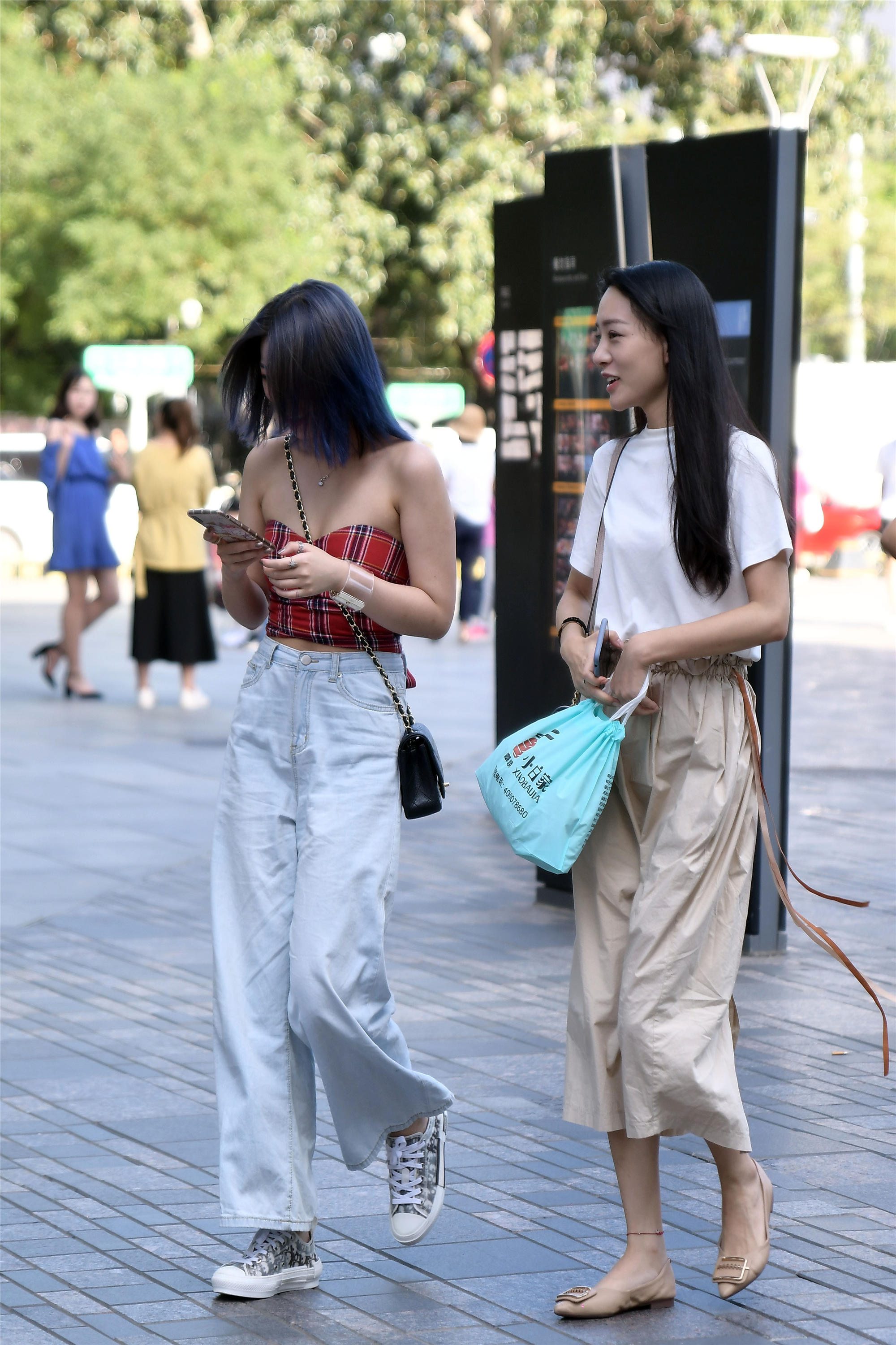 时尚的姑娘,总是有着自己的想法,搭配出自己的味道,这一对闺蜜,搭配很好看,卡其色的七分宽松长裤,露出一点小腿的位置,脚下一双尖头平底鞋,搭配一件白色半袖,身材比例也很好看,而且还有着显瘦的效果,她的闺蜜是一条直筒的浅蓝色牛仔裤,搭配一件红色的格子抹胸,搭配很简单,却彰显自己的个性。