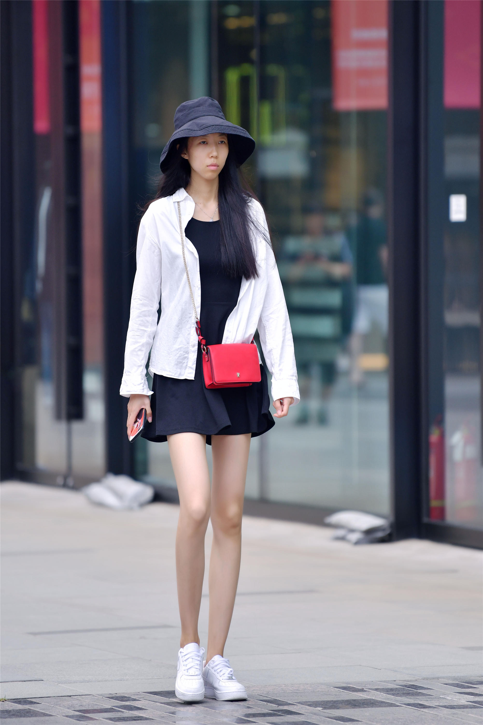 身材高挑的姑娘,她们的搭配也简单很多,一条深蓝色的连衣短裙,有点修身的效果,外面一件白色的衬衫,没有系扣子,有着一点开衫的效果,这样深浅色的对比,增加个性,一顶个性的渔夫帽,帽檐很大,显得人很低调,会让人看起来更加精致一些,脚下一双小白鞋,简单又干净的感觉。