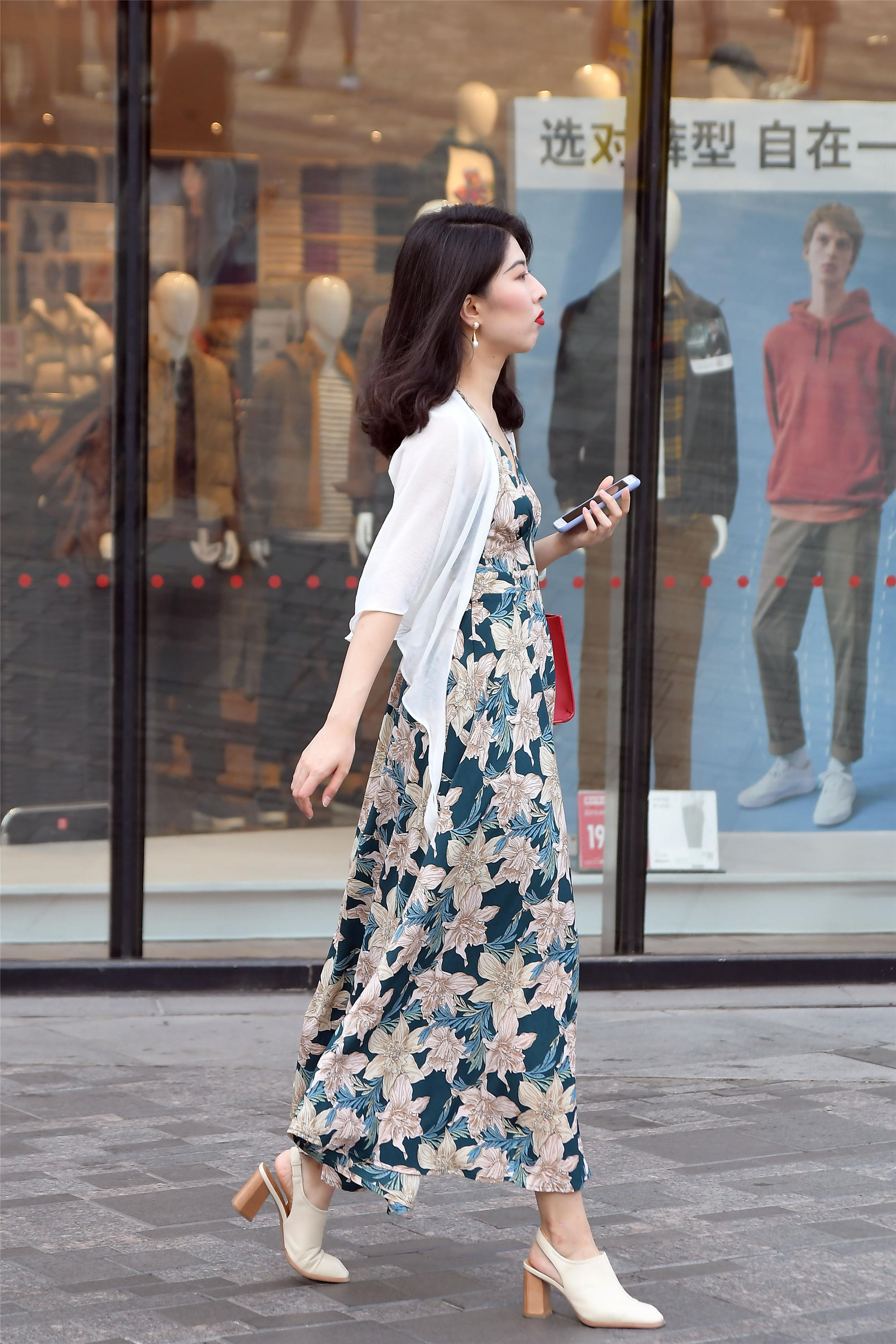 初秋时节的搭配,什么样式的都有,展现出自己的风格,才是最好的,要找到自己喜欢的元素,却是不容易,很多人知道在搭配的时候,知道自己不喜欢那种色彩和款式,但是要挑选哪种款式却不是很清楚,这位美女穿着一款印花连衣长裙,色彩以蓝白色为主,显得很低调,一件白色针织长袖,搭配一下,很好看的组合,搭配出很精致的效果,脚下一双米白色的粗跟凉鞋,也衬托她的身材。