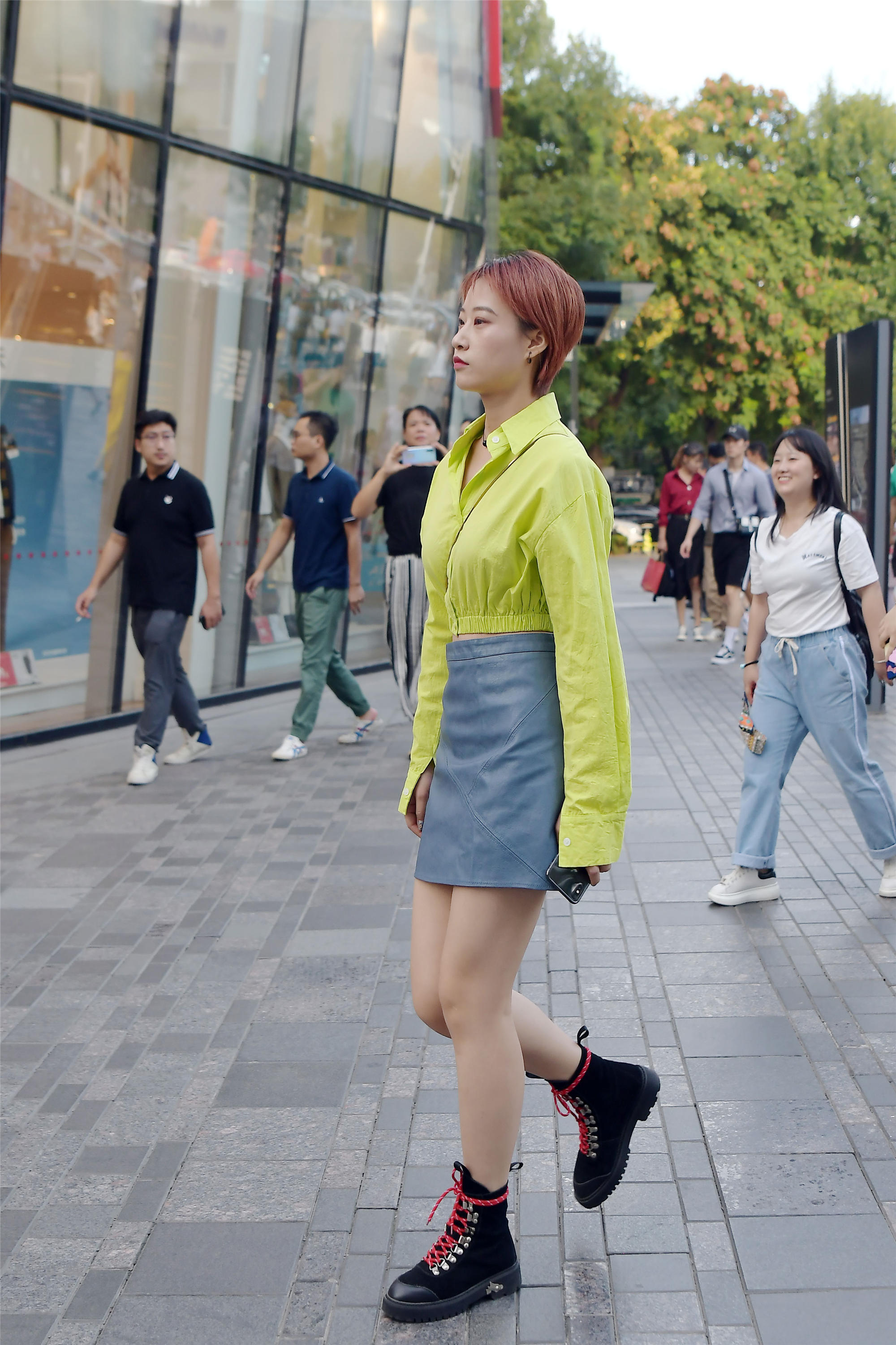 想要搭配出一点自己的个性,就要在服装上注意怎么选择,色彩也可以让你变得不一样,看一下这位美女的穿搭,一件荧光绿的短衣襟小衫,衣摆的松紧设计,领口也很独特,长长的袖子,搭配一条蓝色皮裙,这样的色彩搭配很好看,也穿出身材比例的效果,脚下的黑色马丁短靴,平底的款式,非常休闲的感觉,短发显得人很精致。