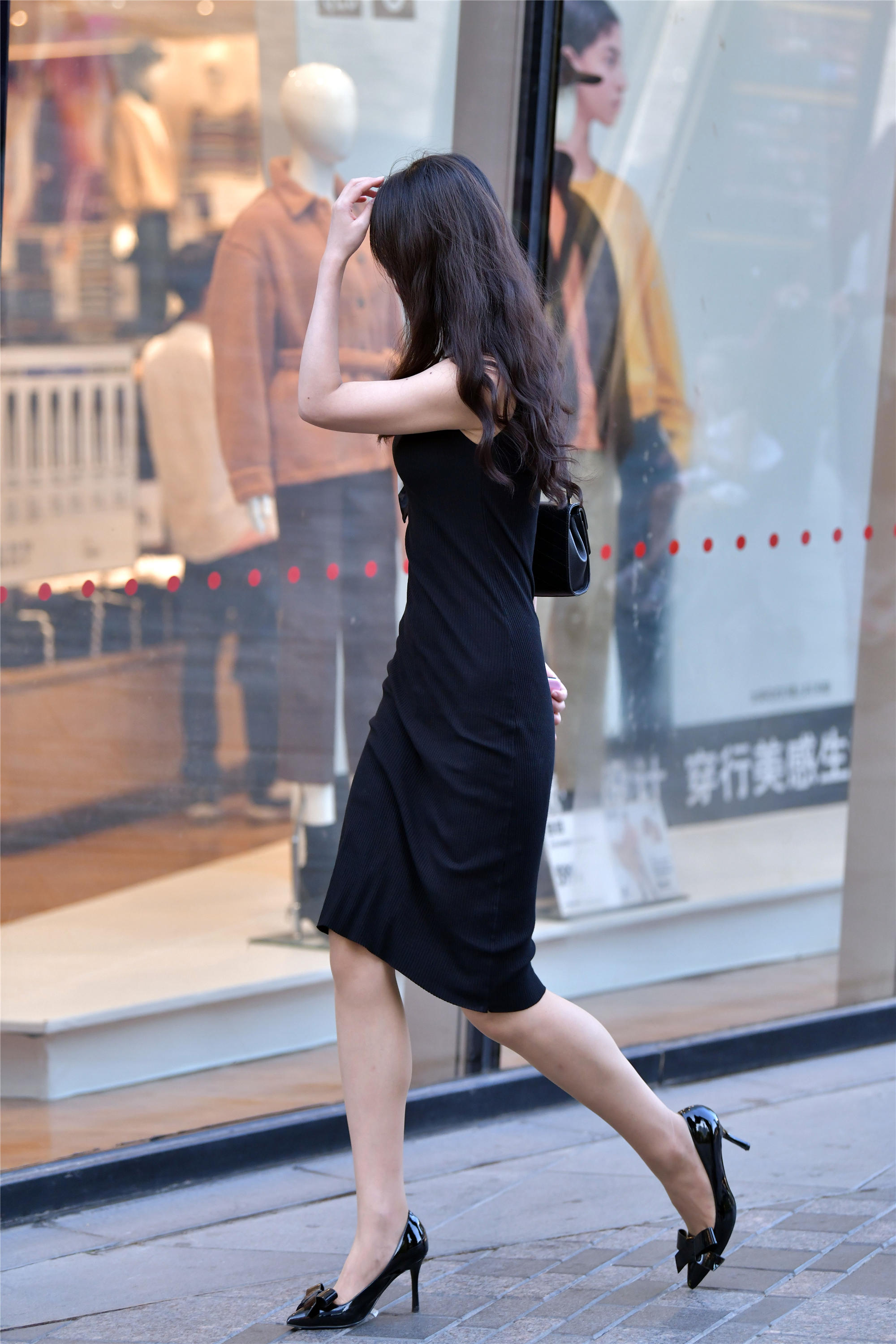 初秋时节,很多姑娘搭配黑色出门,不是因为喜欢黑色,黑色是容易搭配,而且还很显瘦的色彩,这位美女选择一款黑色无袖连衣裙,有着很好的显瘦效果,裙摆到膝盖的位置,也有着一步裙的效果,非常个性,脚下一双黑色尖头细跟单鞋,鞋尖出的蝴蝶结,增加时尚感觉,漆皮的效果,黑色不显单调,也衬托身材高挑。