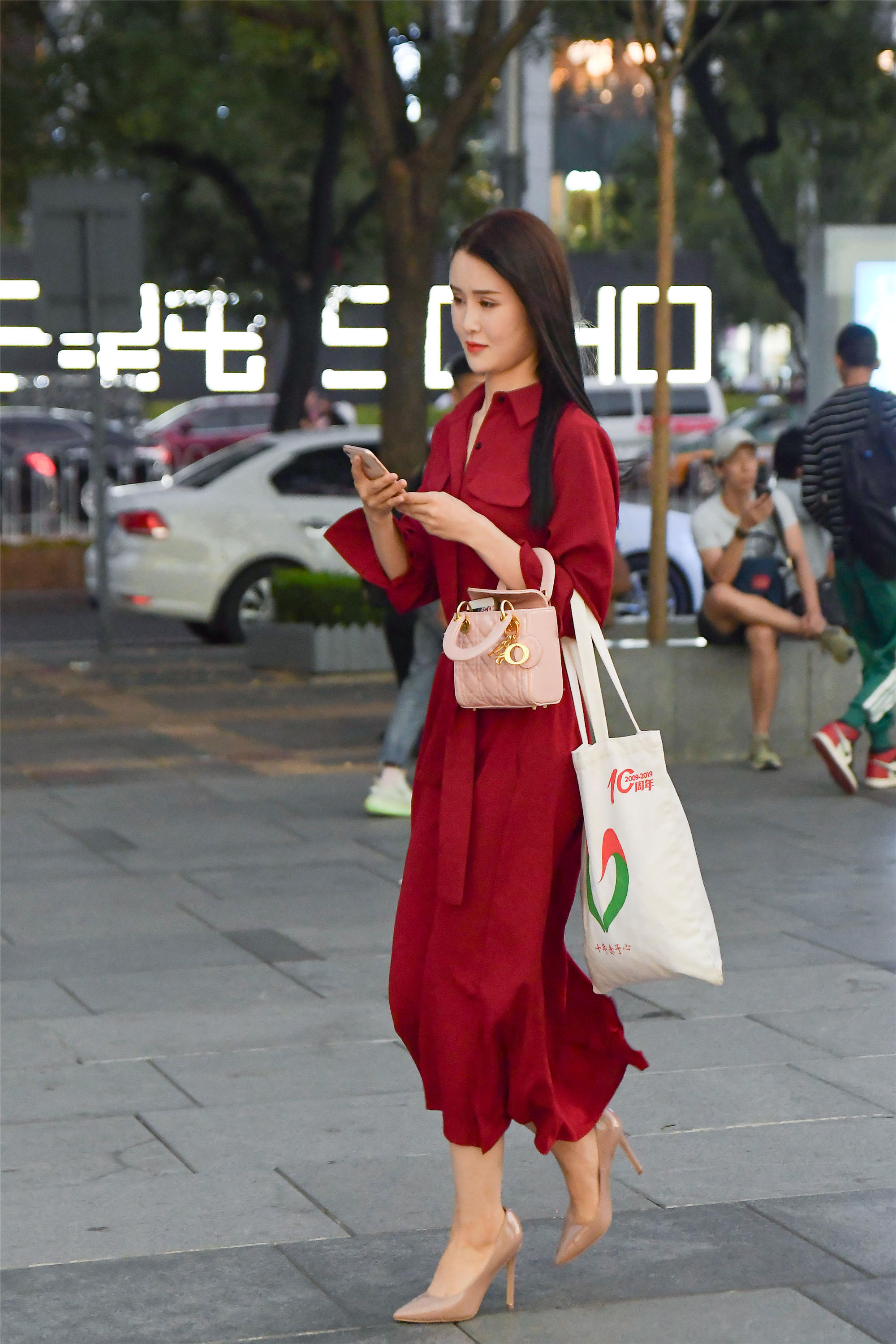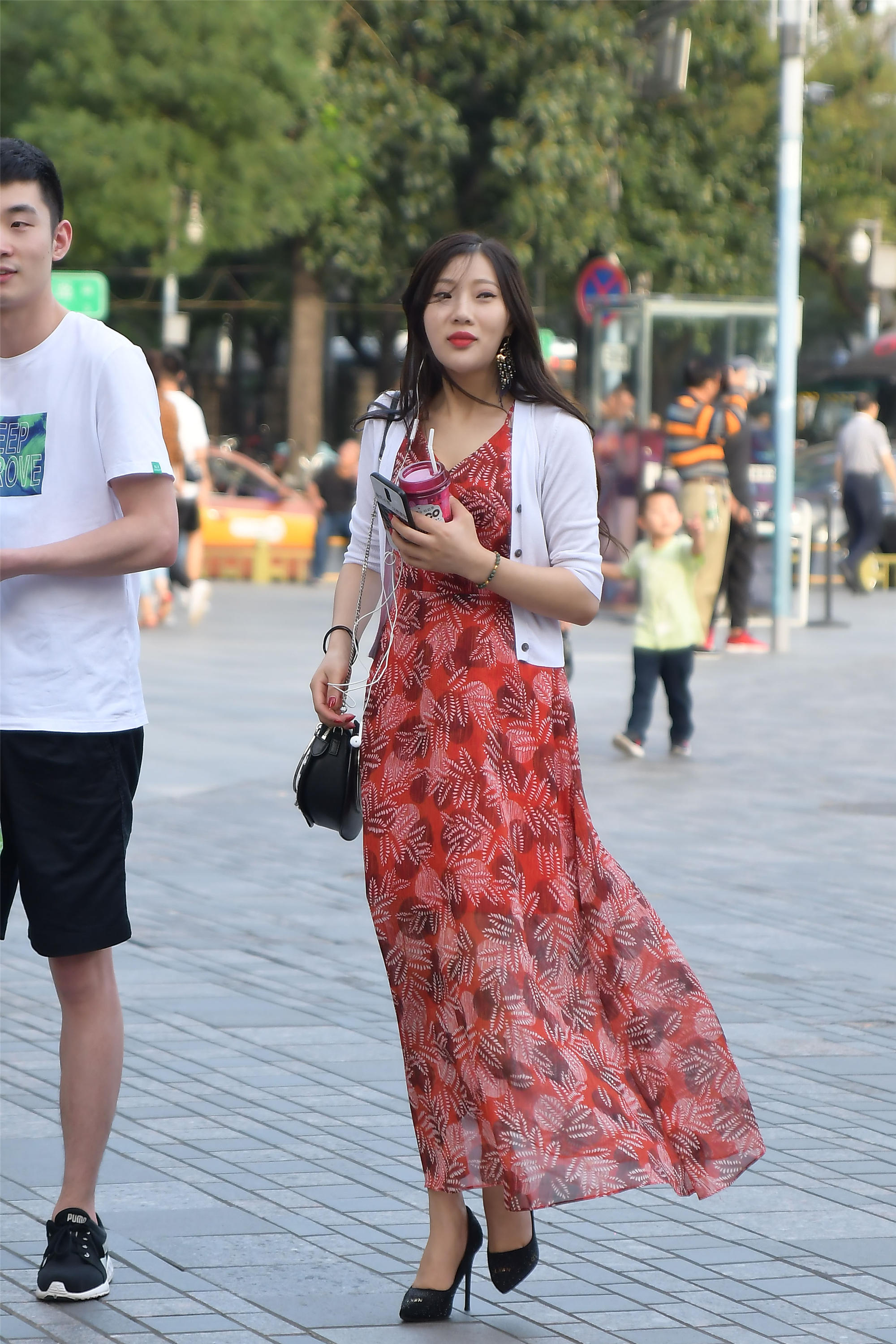 初秋时节,穿着连衣裙逛街,也会搭配出很有意思的效果,这位美女选择一款红色的而连衣裙,上面的白色印花,让红色不是那么鲜艳,裙摆到脚踝的位置,还飘起一些,这样显得很飘逸的效果,外面一件白色的开衫,非常简单,也有着秋天的效果,脚下一双尖头细跟鞋,更好地衬托这款连衣裙,让人看起来更好看。