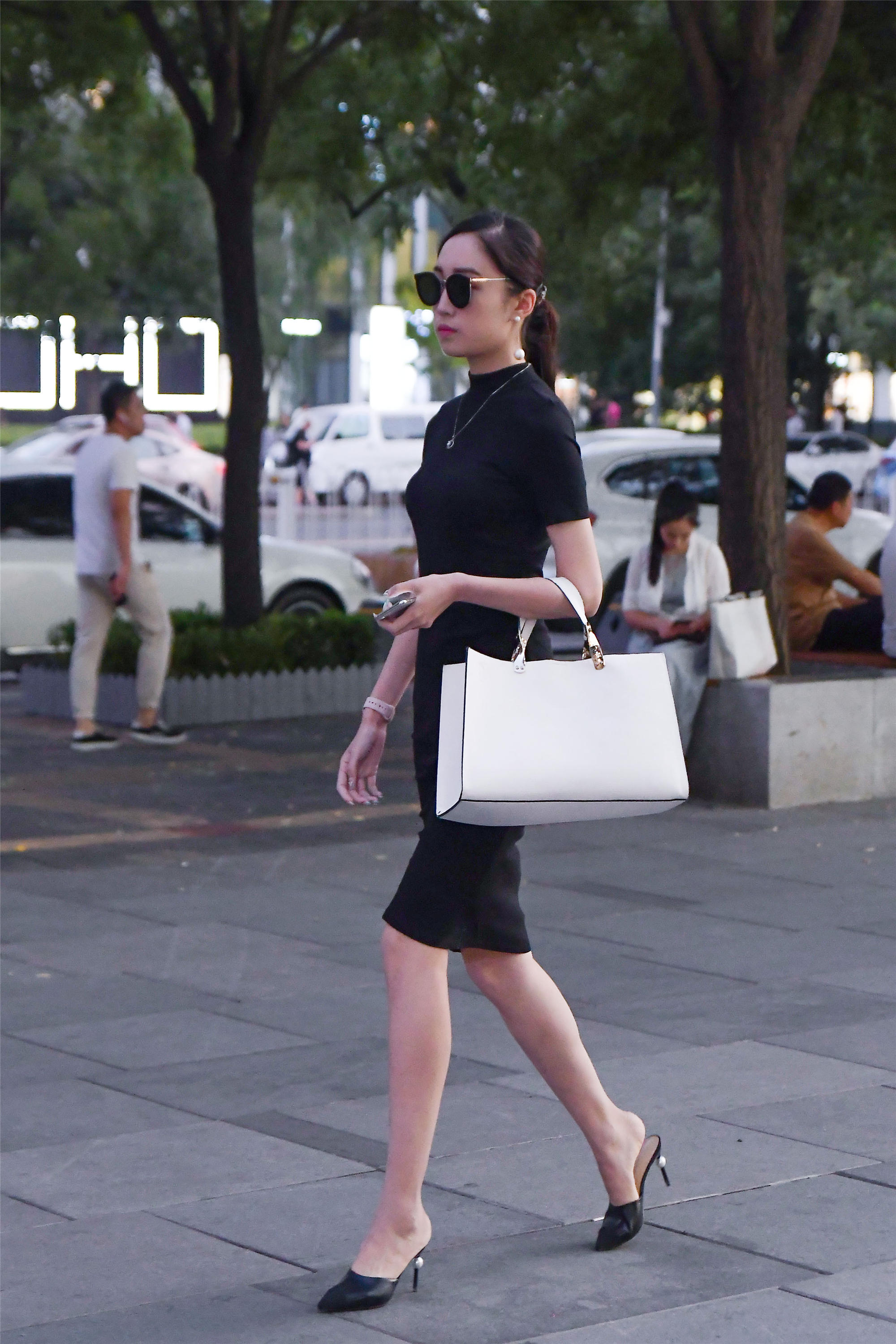 刚刚说过有人穿着修身的衣服,这位美女就是搭配修身的款式,高龄的修身半袖连衣裙,裙摆到膝盖的为主,修身的裙子是比较挑身材的,身材匀称才会搭配出很漂亮的效果,所以能搭配修身裙子的姑娘,都是对自己身材很自信的,一个白色的大拎包,增加色彩对比,脚下尖头细跟凉拖,鞋跟上还有一个珍珠镶嵌,增加个性。