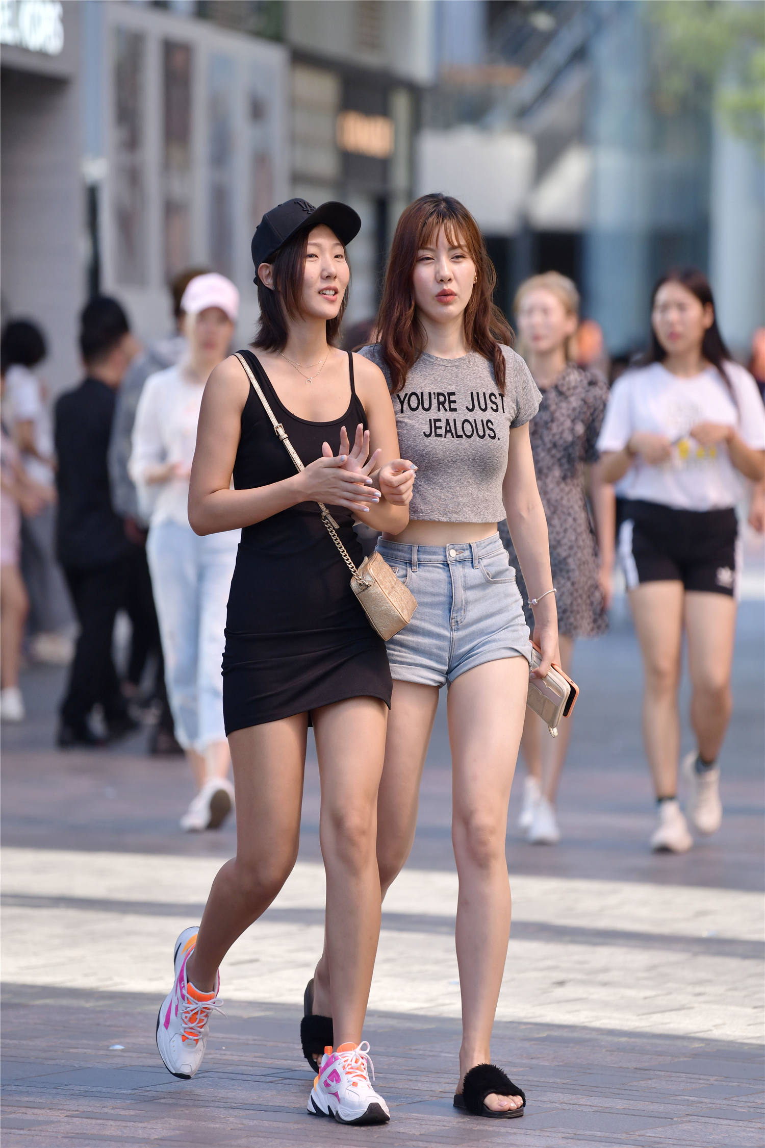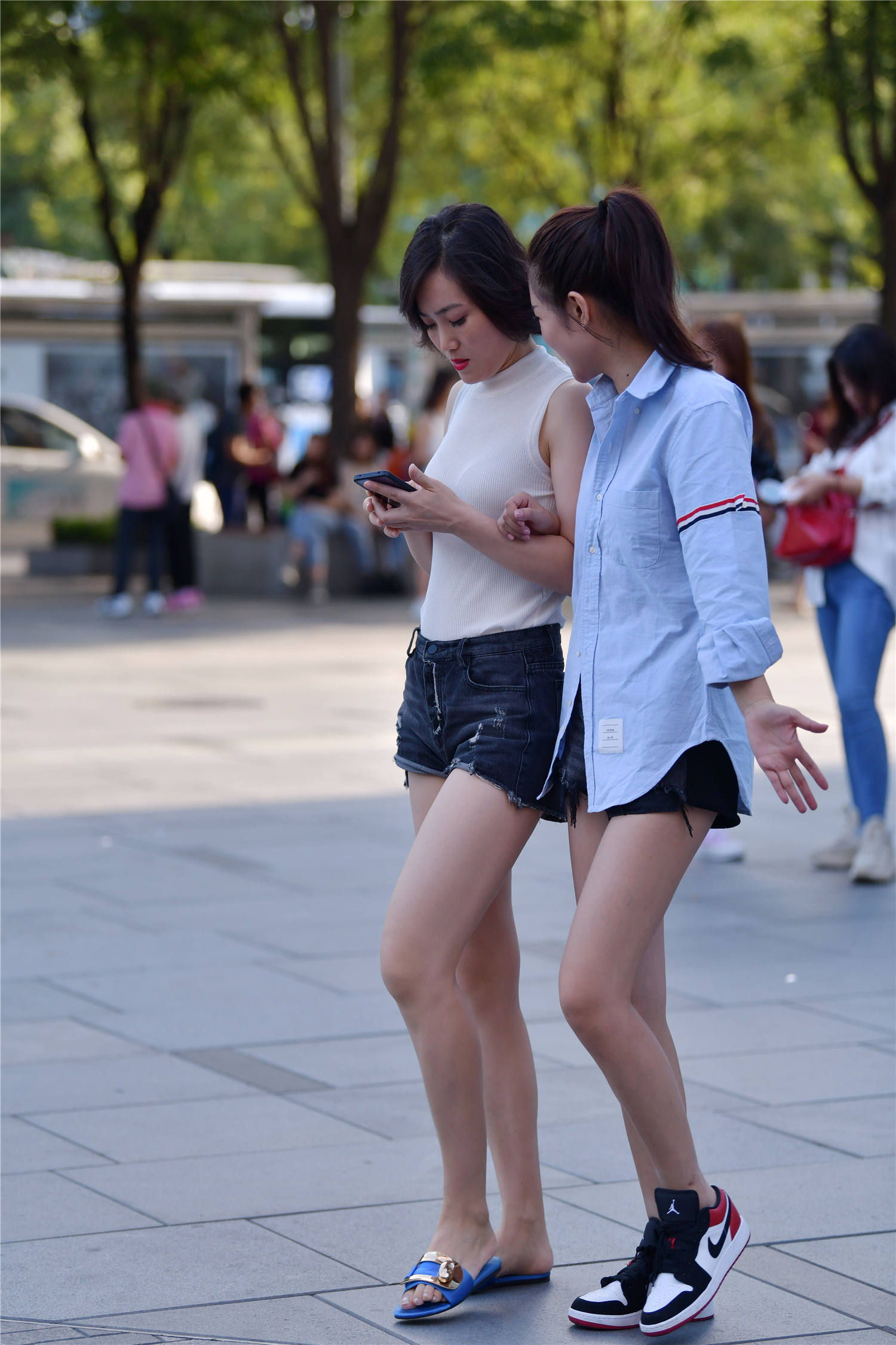很多美女会约上自己的闺蜜一起逛街,而且她们也会搭配一些相似的元素,看一下这两位美女的穿搭,都选择牛仔短裤,却搭配出不同的效果,一位选择高亮修身的无袖小衫,衣摆掖在短裤里面,这样显得身材比例很好,搭配一双蓝色个性拖鞋,她的姐妹是穿着一件蓝色衬衫,遮住自己的短裤,脚下一双运动鞋,非常休闲的穿着。