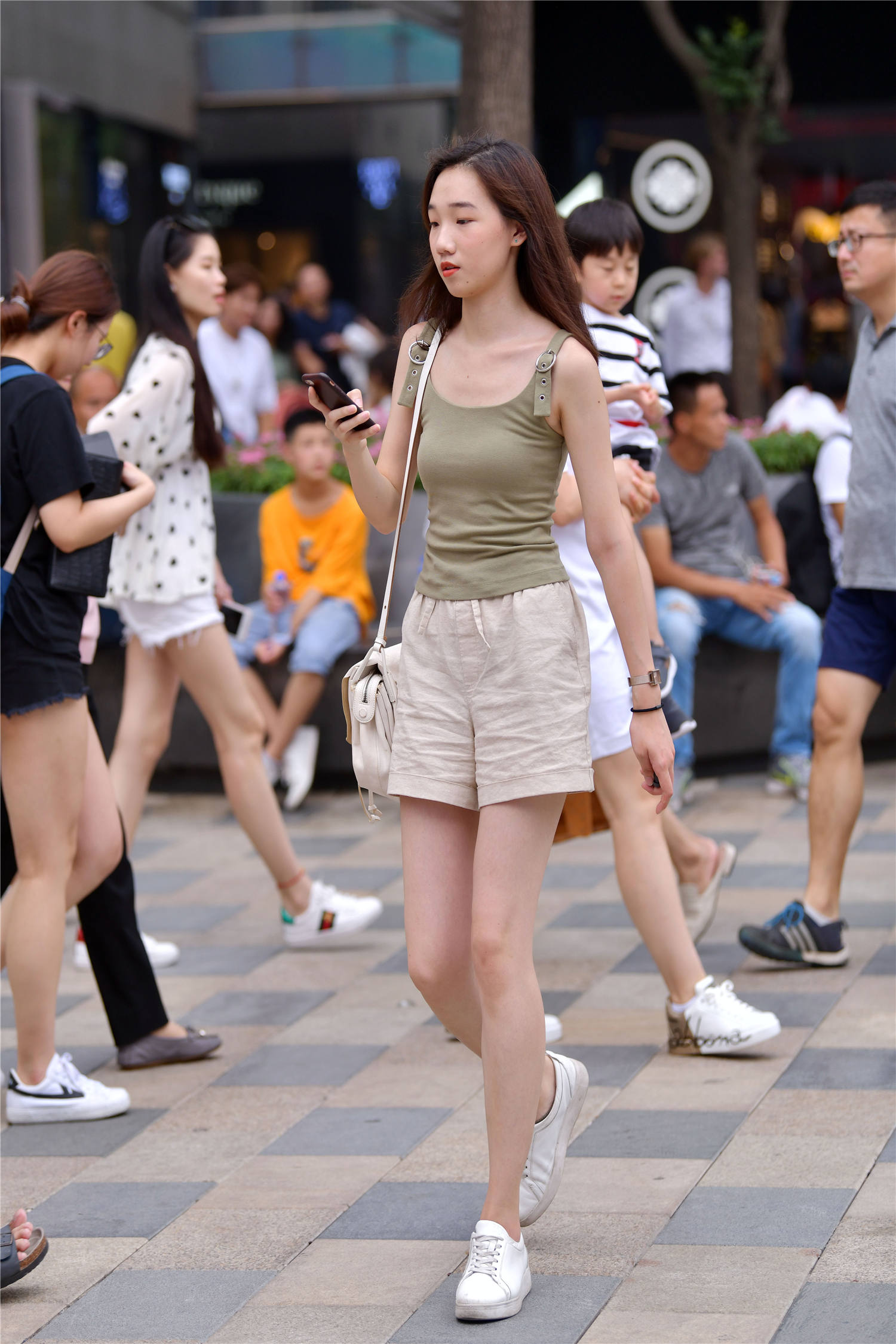 很多姑娘也会选择不一样的短裤,这位美女选择米色的短裤,宽松的裤腿,有着很显瘦的效果,搭配一件深色的背心,吊带出用金属针扣结合,增加个性,也很有层次感,这样搭配很简单,脚下穿着一双平底鞋小白鞋,年轻的姑娘穿搭也很简单,因为她们身材很好,所以怎么搭配都会看起来很美的感觉。