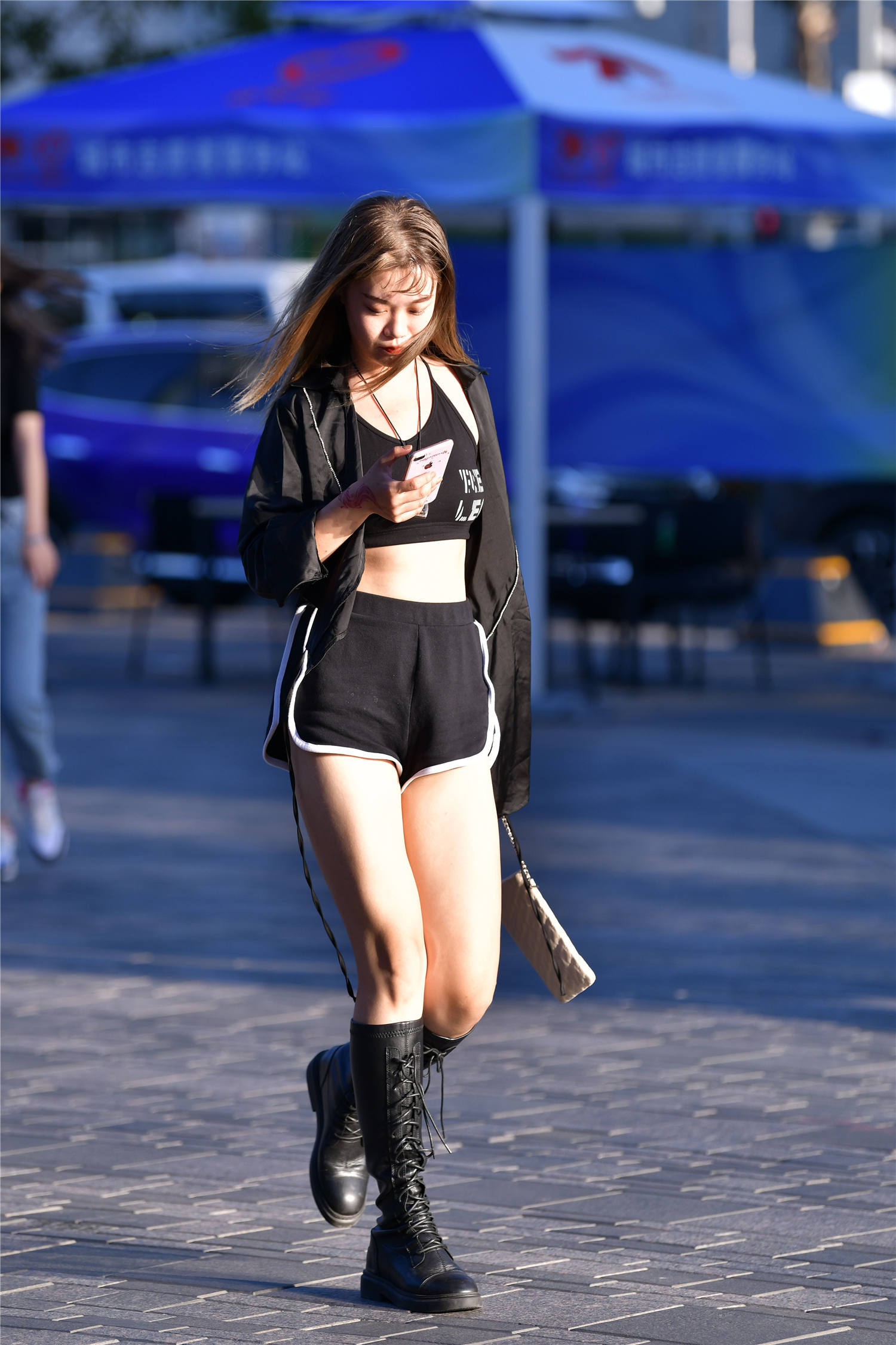 运动的姑娘,搭配出一点运动的风格,这样看起来会有点不一样的味道,这位美女选择一款运动短裤,黑色款式,白色镶边,增加层次感,一款运动胸衣,会搭配出很舒服的效果,一件黑色夹克,起到很好的保暖效果,初秋时节可以这样搭配,脚下一双黑色系带长靴,平底的款式,这样搭配,是不是就有了初秋的效果了。