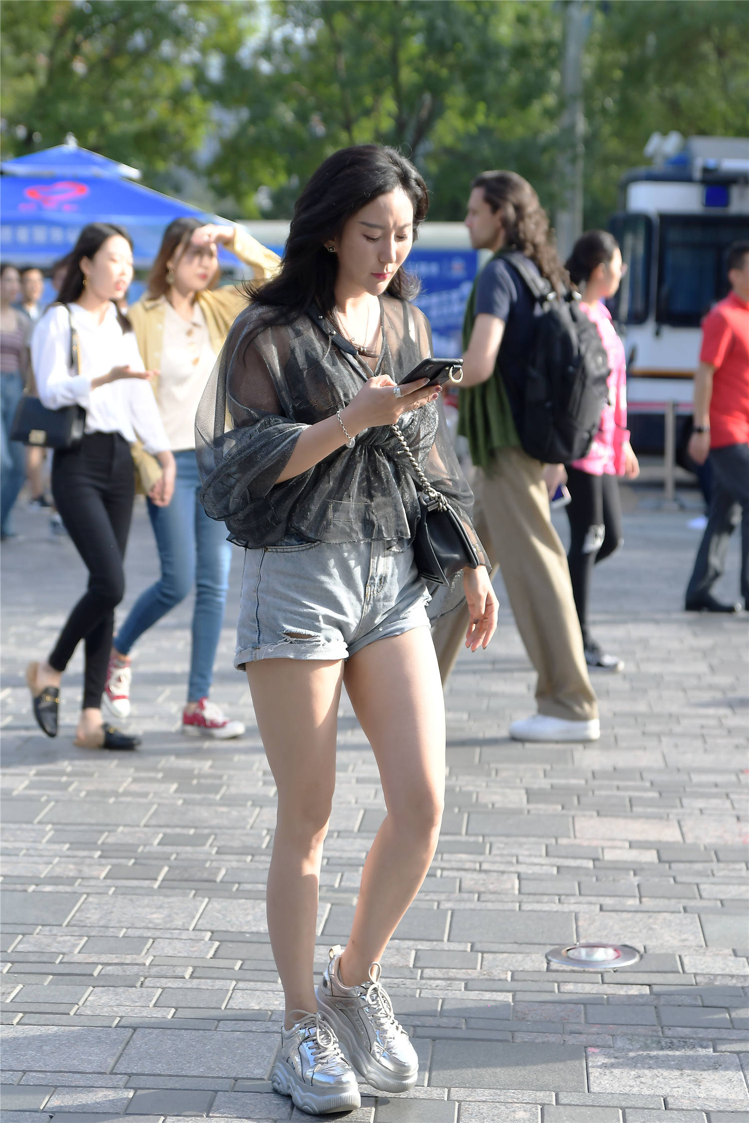 牛仔短裤搭配运动鞋,是非常适合的,而且也会穿出很美的效果,高腰的牛仔短裤,搭配一双银色的厚底运动鞋,黑色的网纱上衣,搭配出很有层次的效果,这样穿搭很简单,也衬托身材的高挑,凸显身材比例效果,初秋时节这么搭配,也是很好看的。