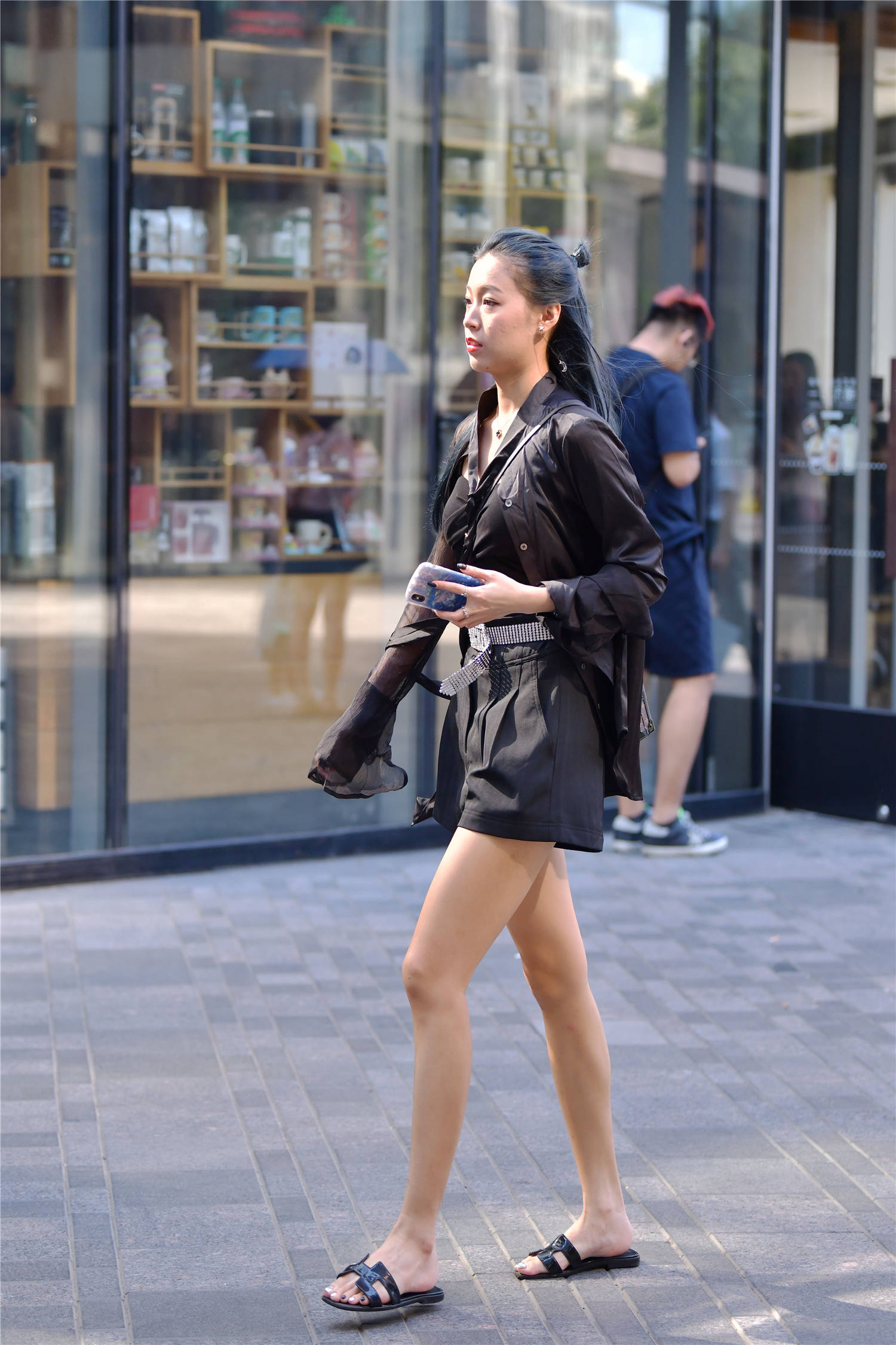 很多姑娘喜欢黑色搭配,也会把黑色搭配出很好看的效果,现在看一下这位美女的穿搭,黑色短裤,高腰款式,搭配一条镶钻的腰带,闪闪的效果,增加层次感,身材比例也很好看,黑色的背心外面一件透视的防晒服,黑色会变得更有层次,脚下穿着一双黑色真皮H拖鞋,非常简单的一身黑色搭配,还很好的凸显自己的身材,是不是很会搭配呢?
