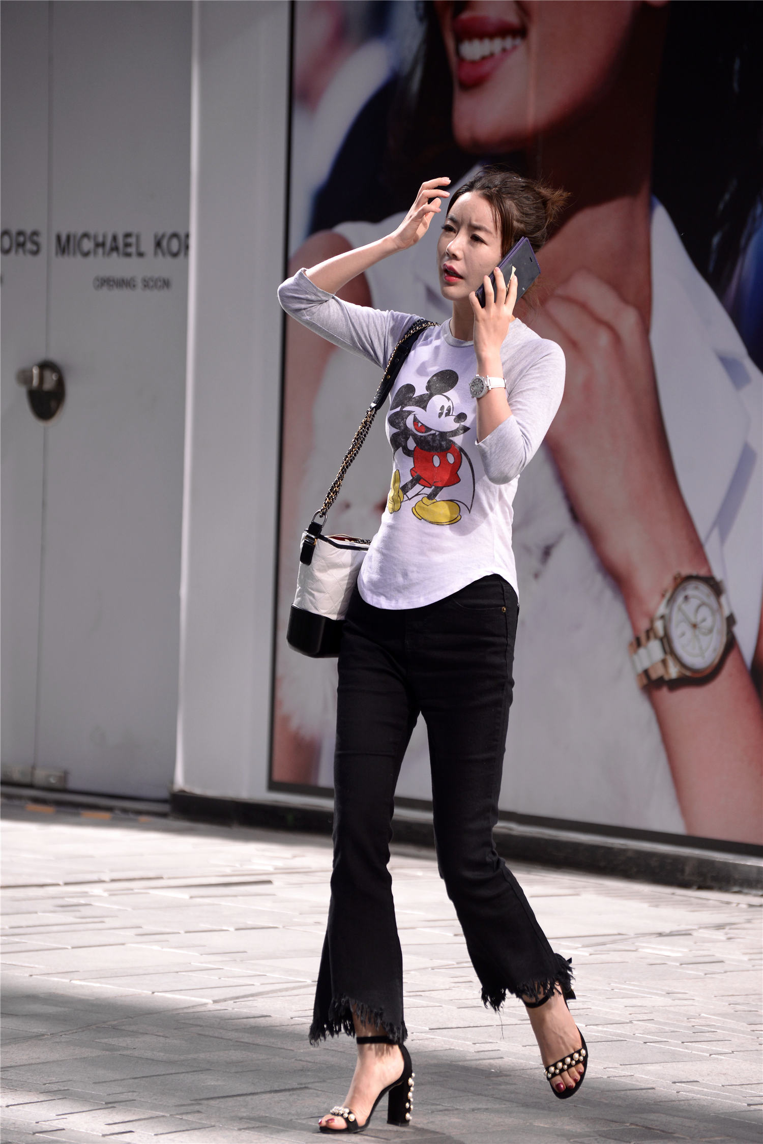 黑色毛边的小喇叭牛仔裤,搭配粗跟一字带凉鞋,怎么着这么好看