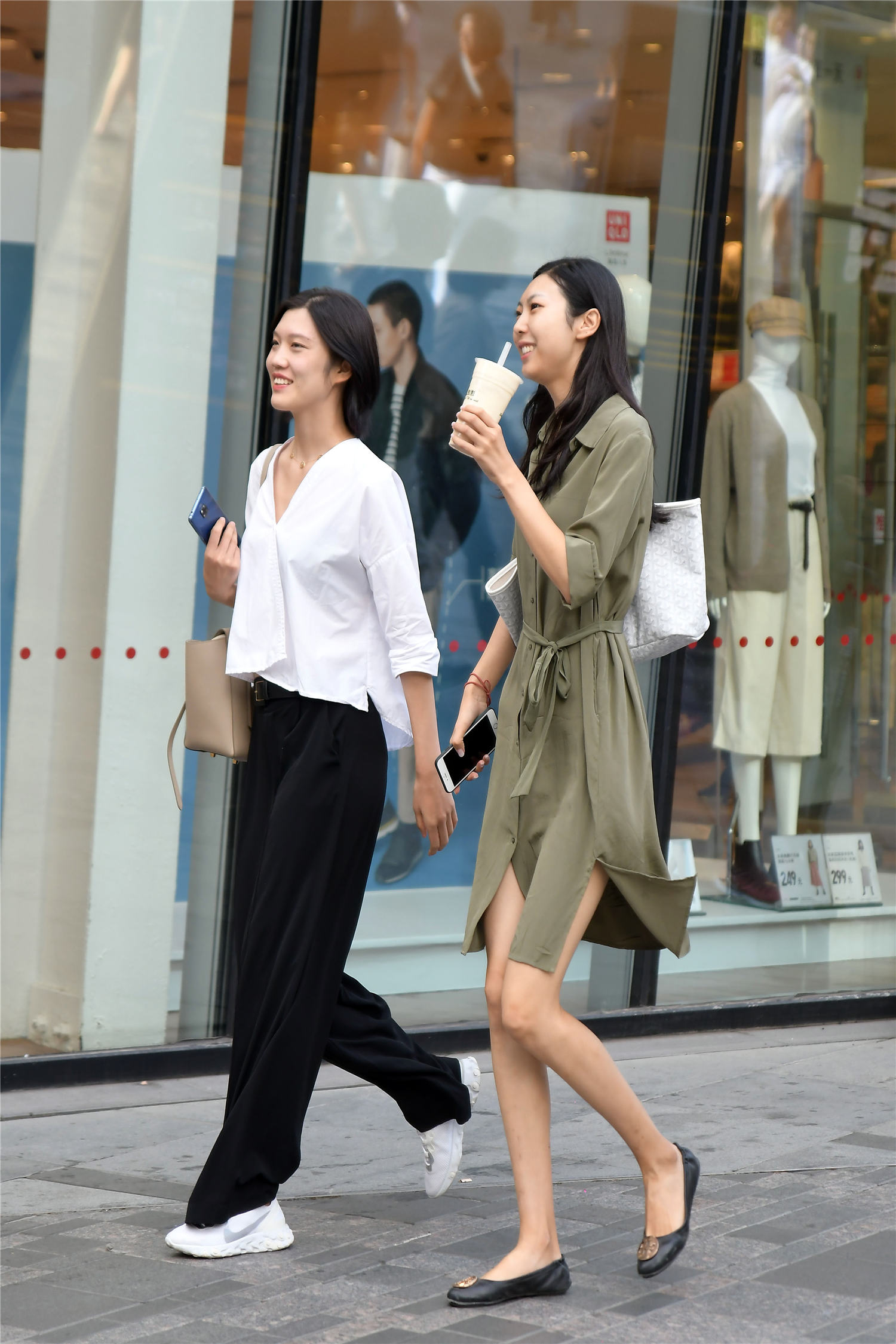 初秋时节约着闺蜜去逛街,要穿出自己的味道,要把自己搭配得漂漂亮亮的,这样才会更有意思,看一下这一对闺蜜,她们的搭配是不同的款式,一位选择白色小衫,不规则的设计,显得很个性,搭配一条黑色高腰长裤,这样会显得身材很好,也有着简约的搭配风格,她的闺蜜选择一款墨绿色的连衣裙,裙摆开叉设计,露出长腿,这样更有显瘦的效果,脚下一双黑色平底鞋,逛街会变得更加舒适。