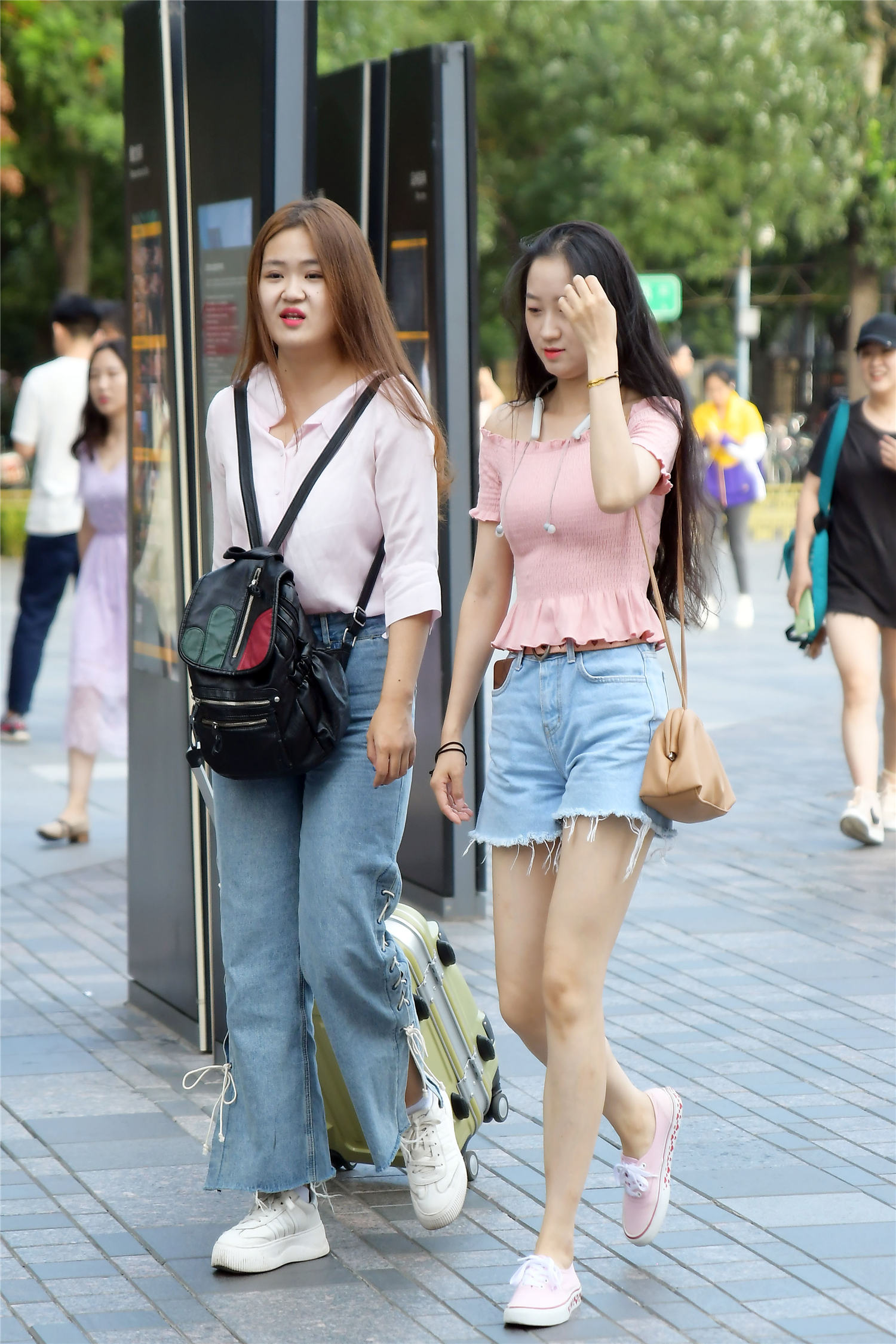 这两位闺蜜,选择牛仔的休闲搭配,一位是毛边的牛仔短裤,搭配粉色的修身半袖,有着休闲和小女生的效果,特别是脚下浅粉色的平底鞋,和半袖色彩相呼应,她的闺蜜选择一款蓝色的牛仔裤,侧面裤腿的串带设计,非常个性,搭配出很独特的效果,一件米白色的小衫,简约搭配,黑色双肩皮包,背在前面,是不是更有个性一些?
