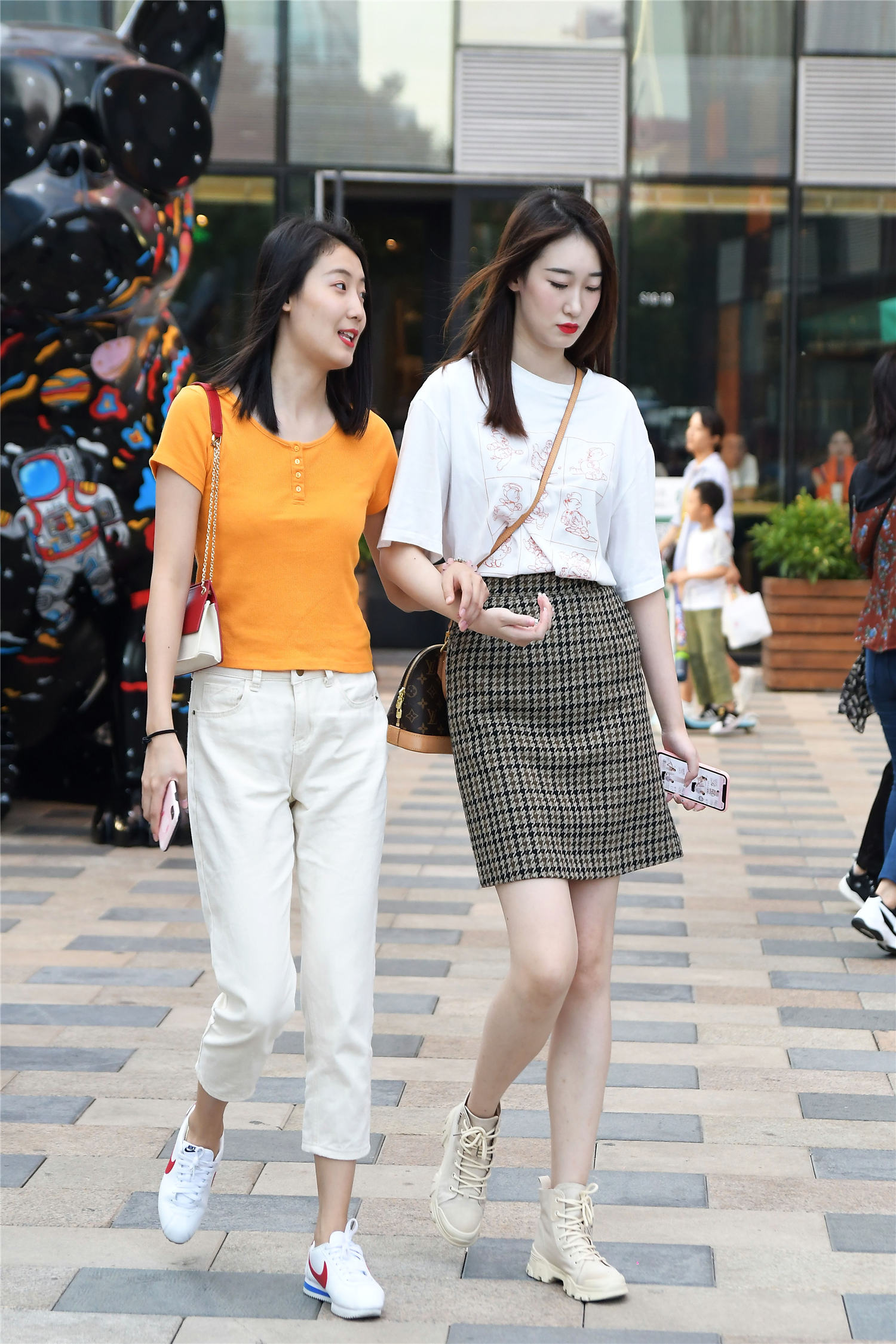 美女喜欢穿出自己的味道,即使和闺蜜一起,也会按照自己的搭配风格来展现自己,看一下这一对闺蜜姐妹的穿搭,一位选择七分长裤,米白色款式,搭配一件橙黄色的半袖,脚下穿着一双白色运动鞋,非常简约的穿搭,她的姐妹是一条高腰的格子筒裙,搭配一件白色半袖,脚下穿着一双米白色的系带短靴,两种风格呈现出来。