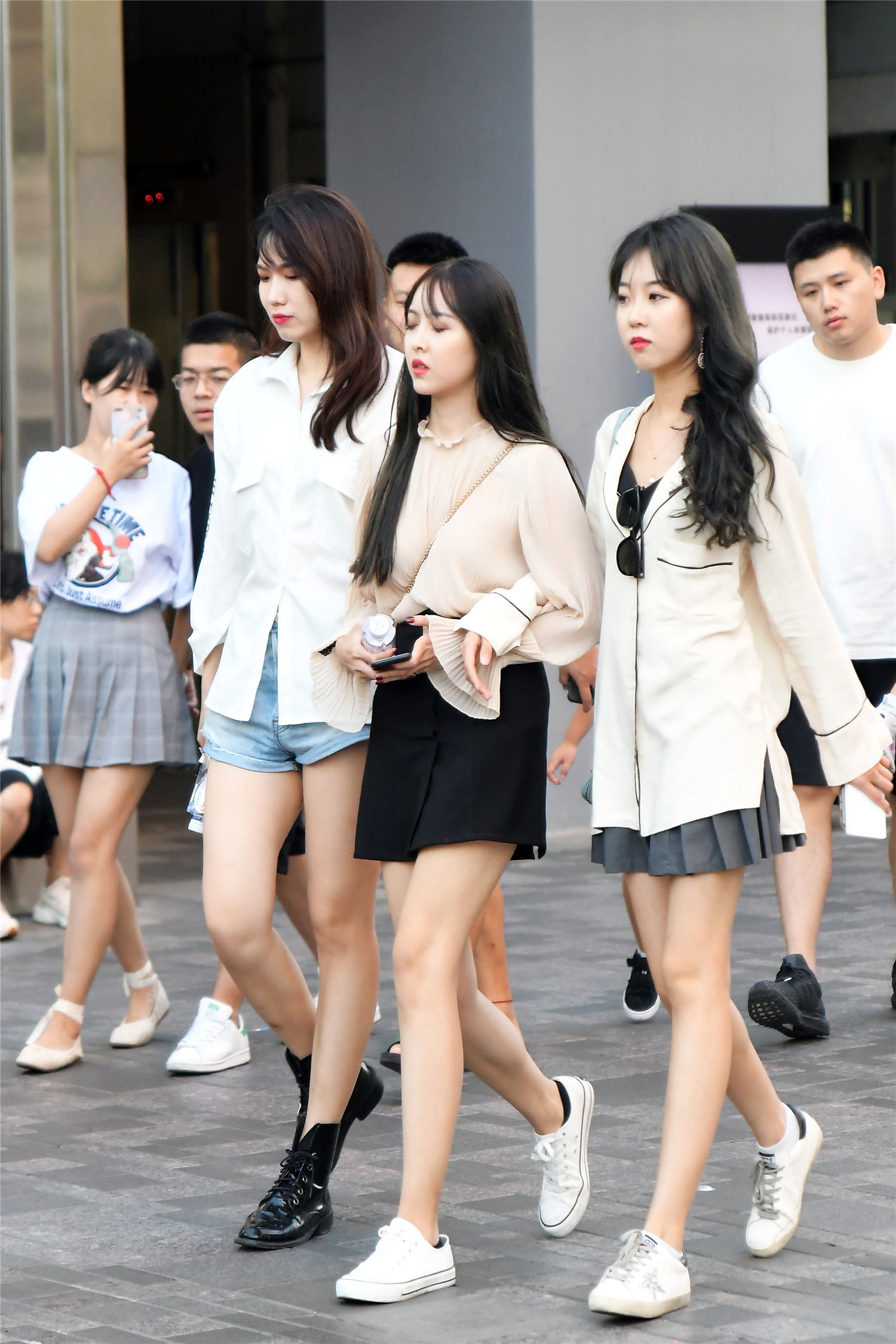 这三位小姐姐,她们搭配短裤短裙,却展现出各自的味道,一位百褶裙搭配长衣襟小衫,一双小白鞋,搭配出清秀的效果,中间的姑娘是黑色高腰裤裙搭配米白色纱料小衫,很简约的搭配,她身边上的另一位姐妹是蓝色牛仔裤搭配白色衬衫,一双黑色短靴,带着一点秋天的搭配效果,三位姐妹的搭配,都是各有特点。