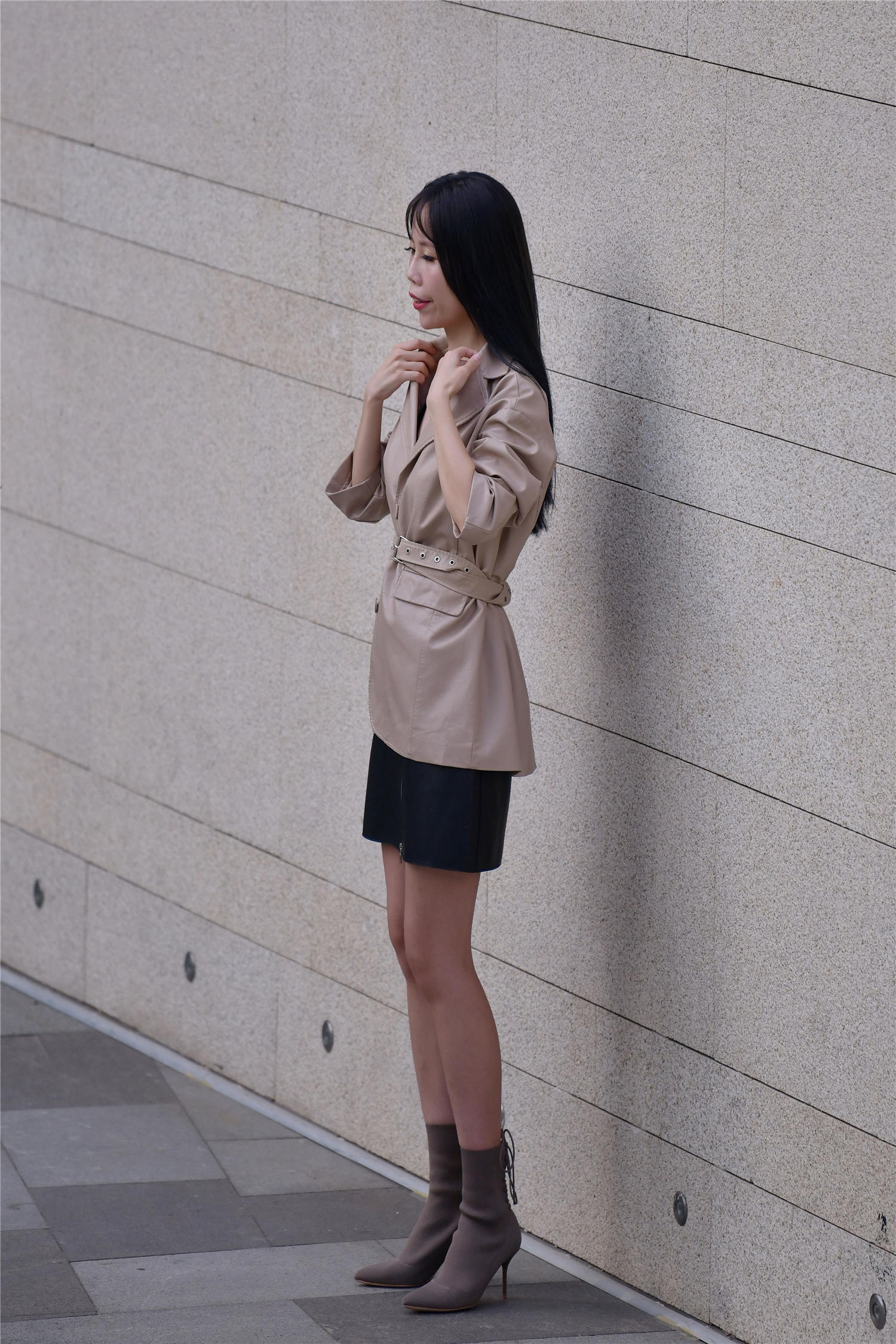 短靴的款式也有很多,每一位姑娘都会搭配出自己的风格,看一下这位时尚姑娘的穿搭,一双深灰色的袜靴,尖头细跟的款式,短靴后面的鞋带设计非常好看,也增加层次感,浅灰色的皮质大衣搭配一条黑色筒裙,这样色彩有着很好的层次,也搭配出显腿长的效果,而且有着秋天的搭配效果,富有层次服装搭配。