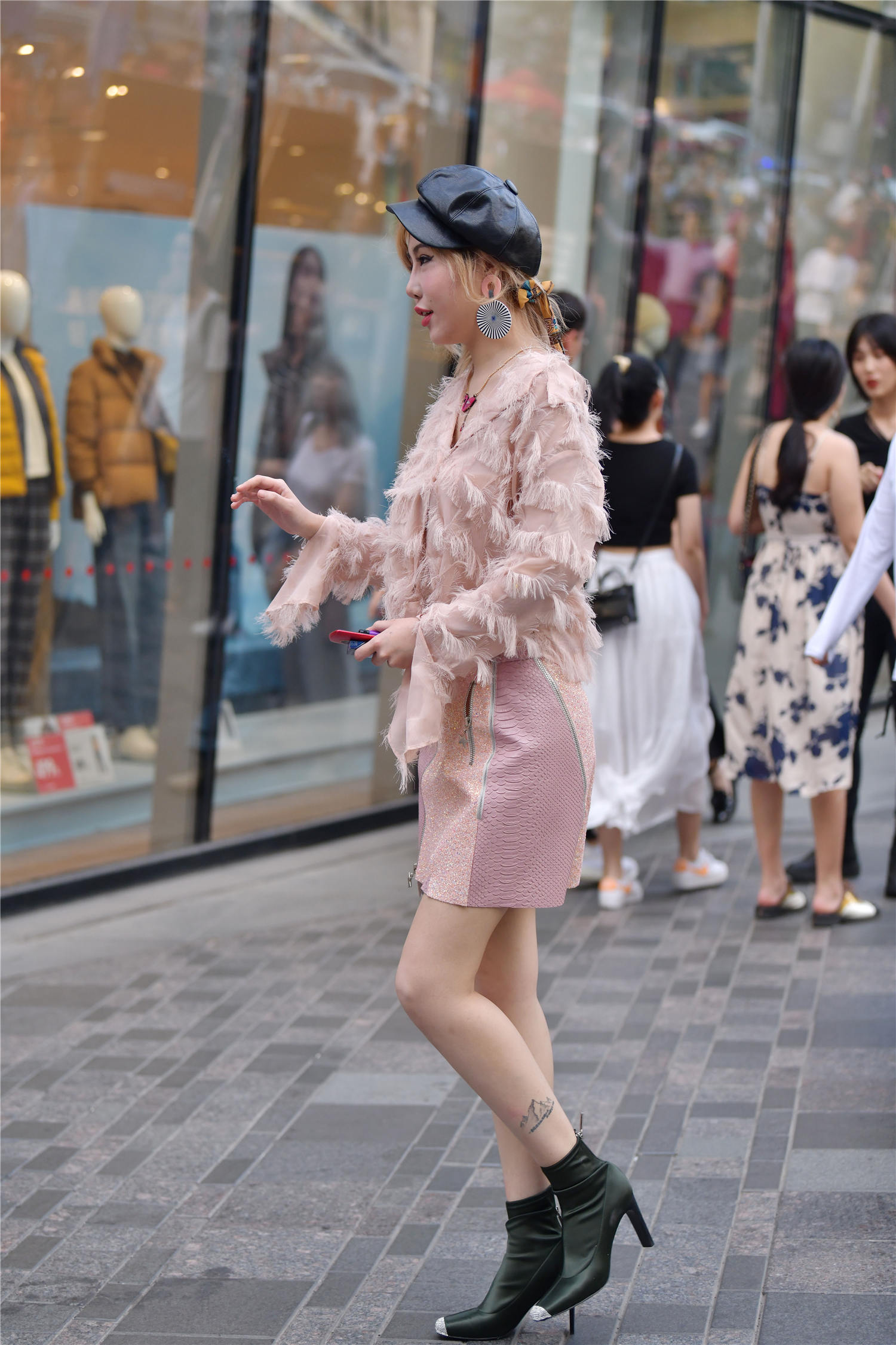 选择一身服装来衬托短靴,是很有必要的,通过不同的色彩搭配,互相衬托,这样也会展现出很美的效果,看一下这位时尚美女的搭配,一顶黑色的皮帽,非常精致的效果,流苏的小衫,浅粉色的色彩,搭配一条粉色蛇皮和亮片拼接的皮裙,非常好看,也富有层次感,有着显年轻的效果,脚下一双黑色短靴,金属的鞋尖,鞋跟很高,有着很好看的弧度。