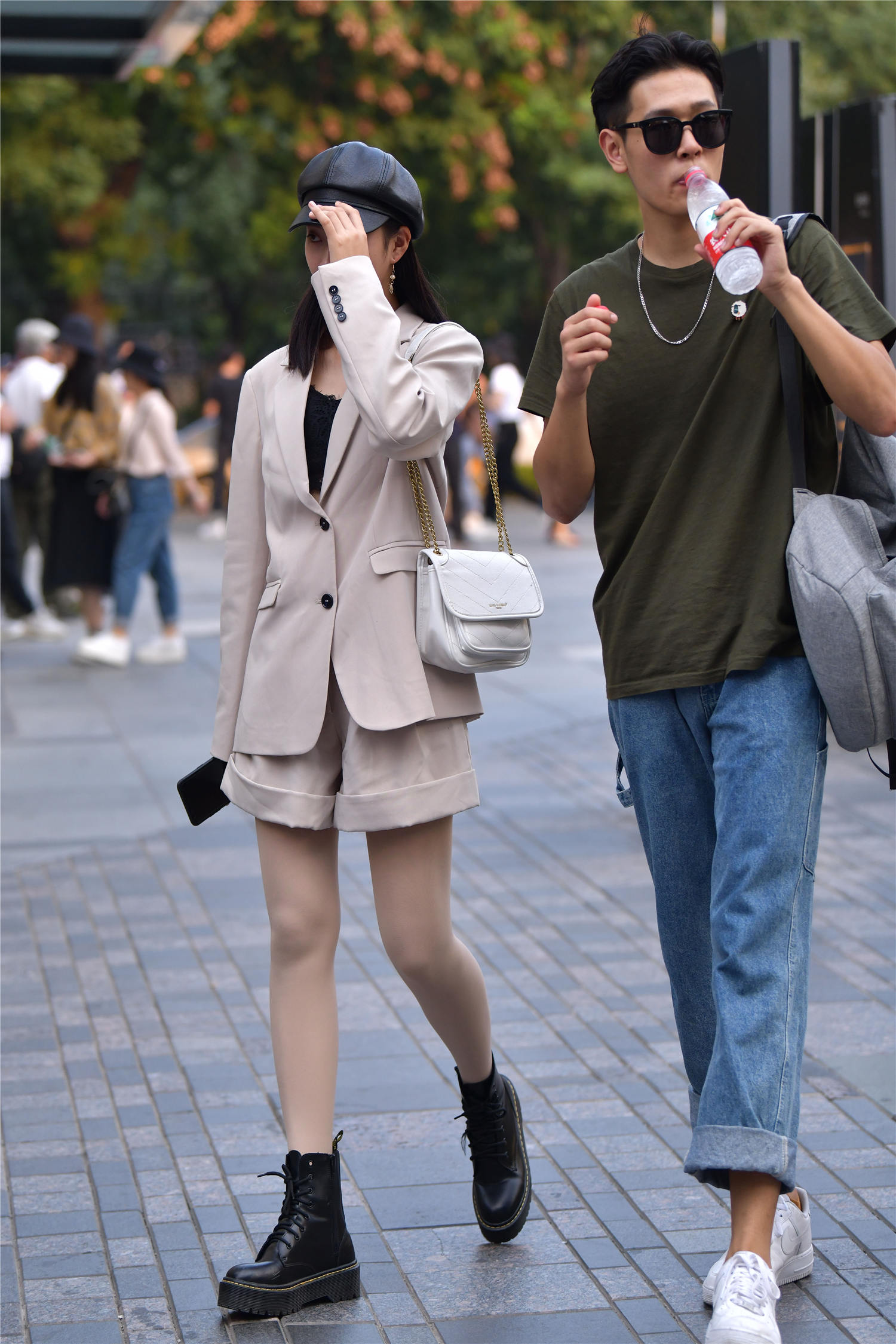 很多姑娘选择的色彩,也是很简单的,这样搭配会变得容易很多,这位姑娘选择一款米灰色的休闲西服,黑色衬衣作为内搭,因为在秋天,姑娘把西服的两个扣子全部都系起来,一般只需要系一个扣子最好,一条翻边的短裤,和西服色彩和材质相同,搭配出很精致的效果,脚下一双黑色圆头短靴,和黑色帽子相互行,这样色彩比较简单,看着也很好看。