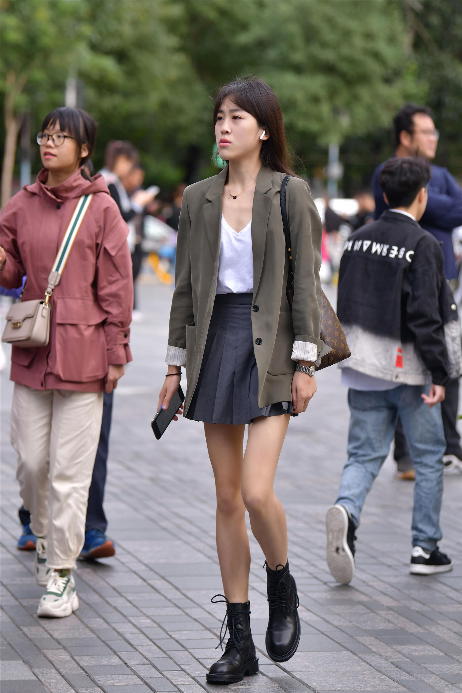 秋天的短靴,很多姑娘会选择圆头系带的款式,有着工装鞋的效果,显得人很年轻,看一下这位美女的穿搭,一条灰色的百褶裙,高腰的款式,搭配一件白色吊带,外面一件深色休闲西服,这样搭配出很好的身材比例效果,而且也显腿长,脚下一双黑色系带圆头皮鞋,增加色彩的深度,搭配色有了渐变的感觉,也是很有意思的搭配。