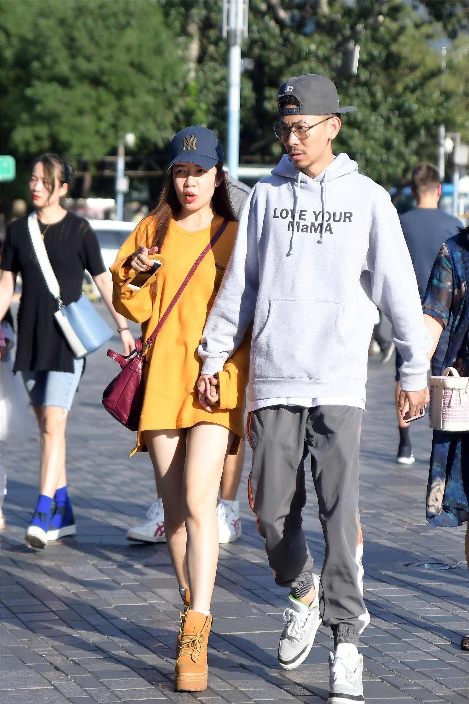 秋天也有自己的色彩,如果你喜欢黄色,可以在这个秋天搭配一下,展示自己,这位姑娘选择一款黄色卫衣,长衣襟的款式,搭配出很精致的效果,脚下穿着一双黄色短靴,厚底的款式,有着增高的效果,头顶一个深灰色的鸭舌帽,也有着显年轻的效果,一身搭配,很好看,也显得人很年轻,非常适合小女生来穿搭效果。