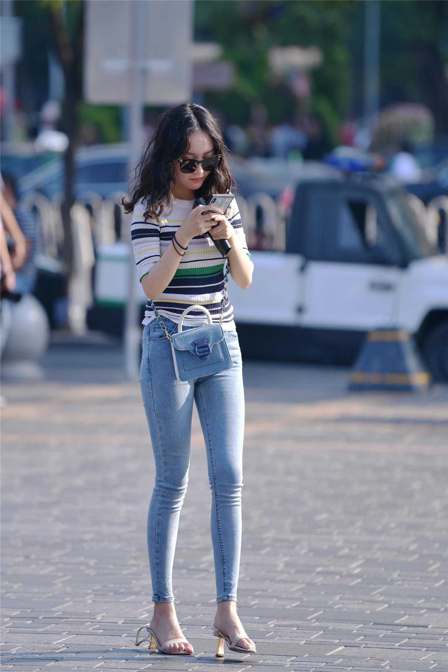 牛仔裤的搭配很多,在秋天很多姑娘,也会选择穿搭牛仔裤出门,时尚姑娘会选择适合自己的牛仔裤,很多身材匀称又略带一点小丰满的姑娘,会穿着修身的牛仔裤来搭配,这位小姐姐选择弹力牛仔裤,裤脚刚好到脚踝的位置,更好的展现她的高跟凉鞋,一件横条纹的针织小衫,这样搭配,更好的衬托她的身材,也搭配出气质的效果来。