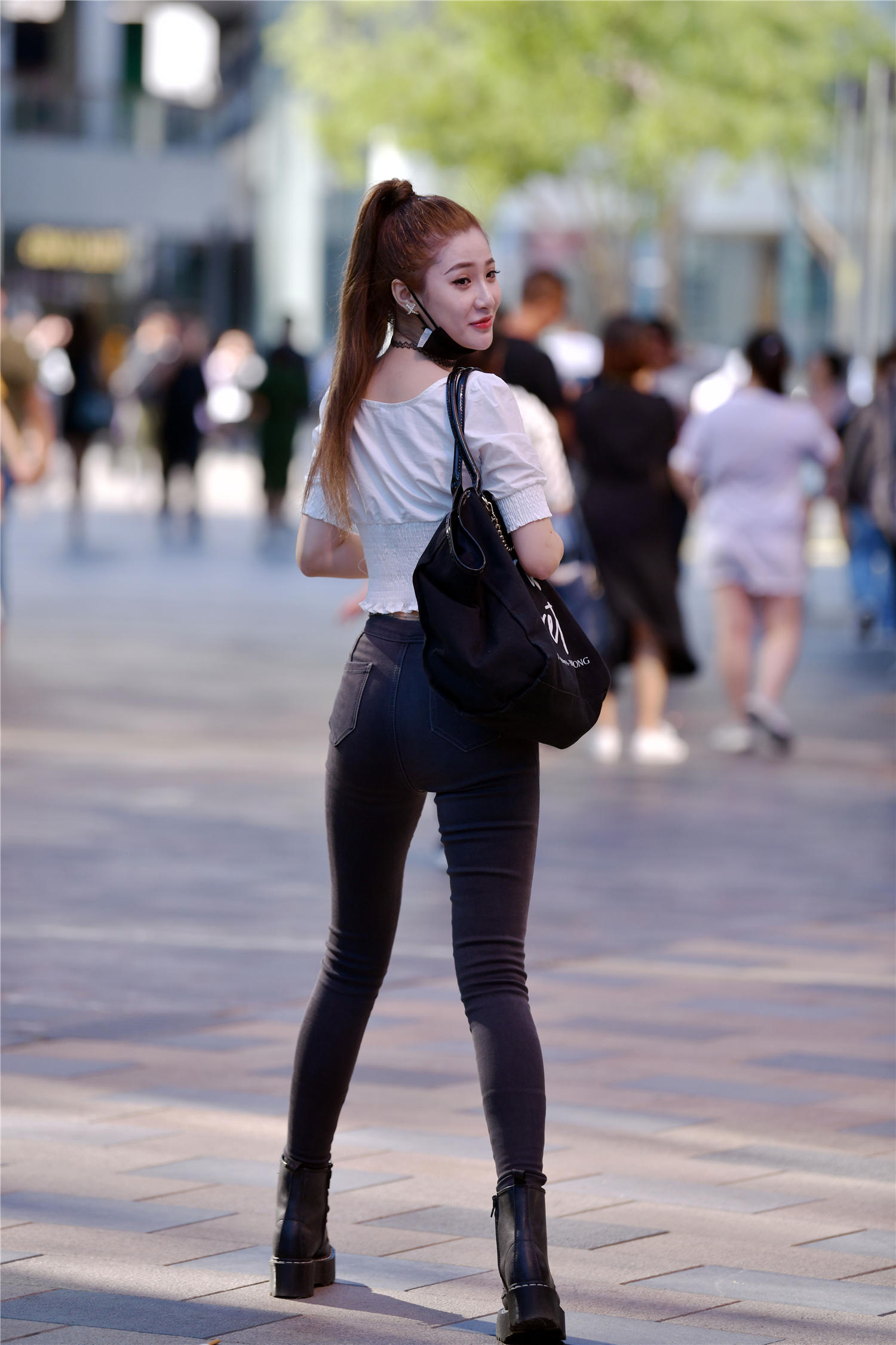 每一位逛街的美女,她们选择的搭配方式都不一样,虽然都是修身牛仔裤的穿搭,却又各自展现不一样的美,这位美女选择一款黑色的高腰修身牛仔裤,搭配一双黑色短靴,有着小女生的搭配味道,一件白色的衬衣,松紧的收腰和袖口,有着显瘦的效果,也展现身材比例,这样搭配很好的展现姑娘的自信。