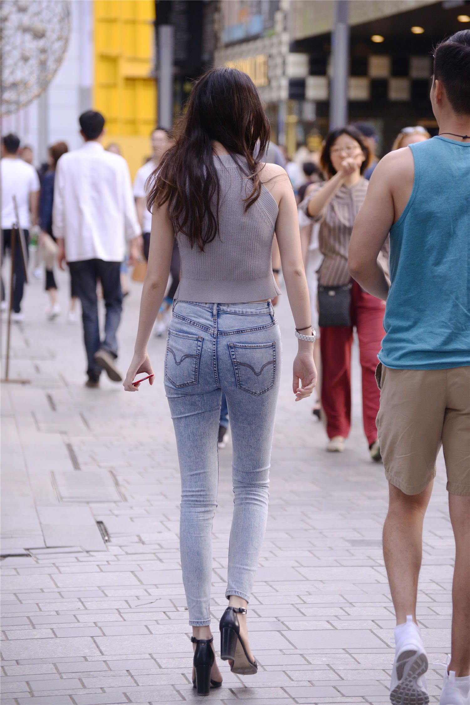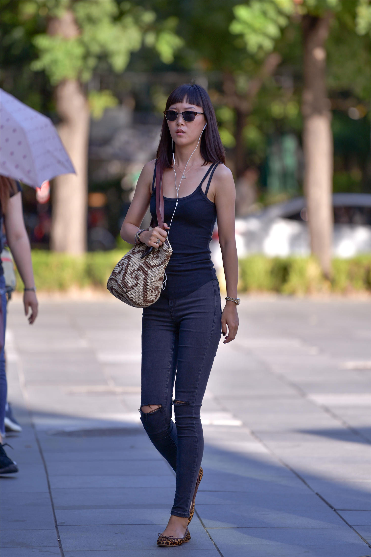 初秋时节,适合搭配牛仔裤,特别是降温后的北方,很多姑娘会选择牛仔裤来搭配,修身的牛仔裤还很好的展现身材,这位美女选择深蓝色的修身牛仔裤,裤脚刚好到脚踝的位置,而且还有一个开叉设计,很个性的感觉,搭配一件深灰色的吊带背心,这样会很显身材比例,脚下穿着一双深灰色尖头细跟鞋,更好的衬托她的身材,高挑又匀称。