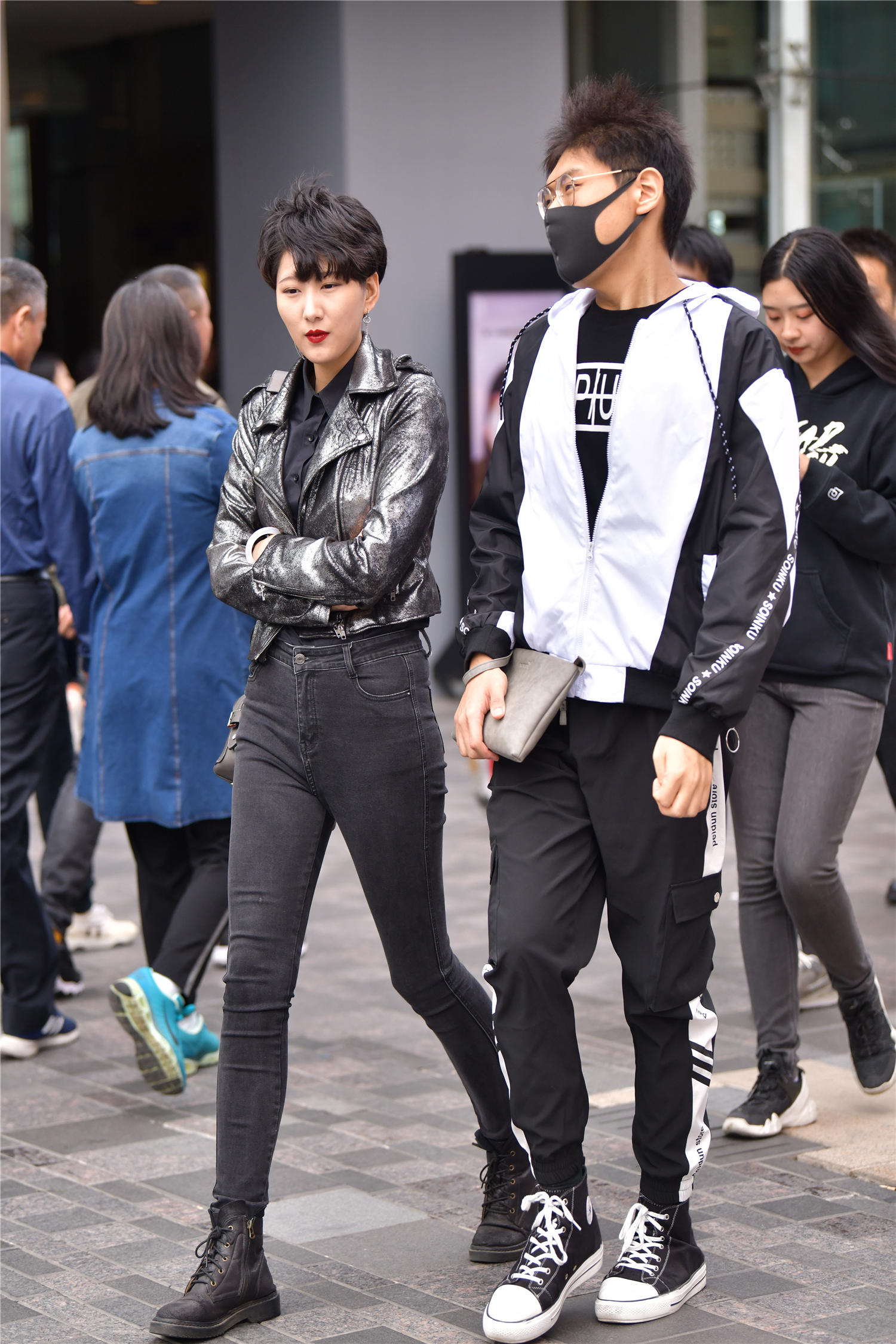 秋天,要搭配出秋天的味道,选择牛仔裤,保暖还时尚,很多姑娘也会搭配得很漂亮,这位美女选择深色系的搭配,深灰色的修身牛仔裤搭配一双黑色的皮质短靴,黑色衬衫外面一件铅灰色的亮光皮夹克,是不是搭配出秋天的味道了,而且也很好的展现她的身材比例,一头精致的短发,带着干练风格。