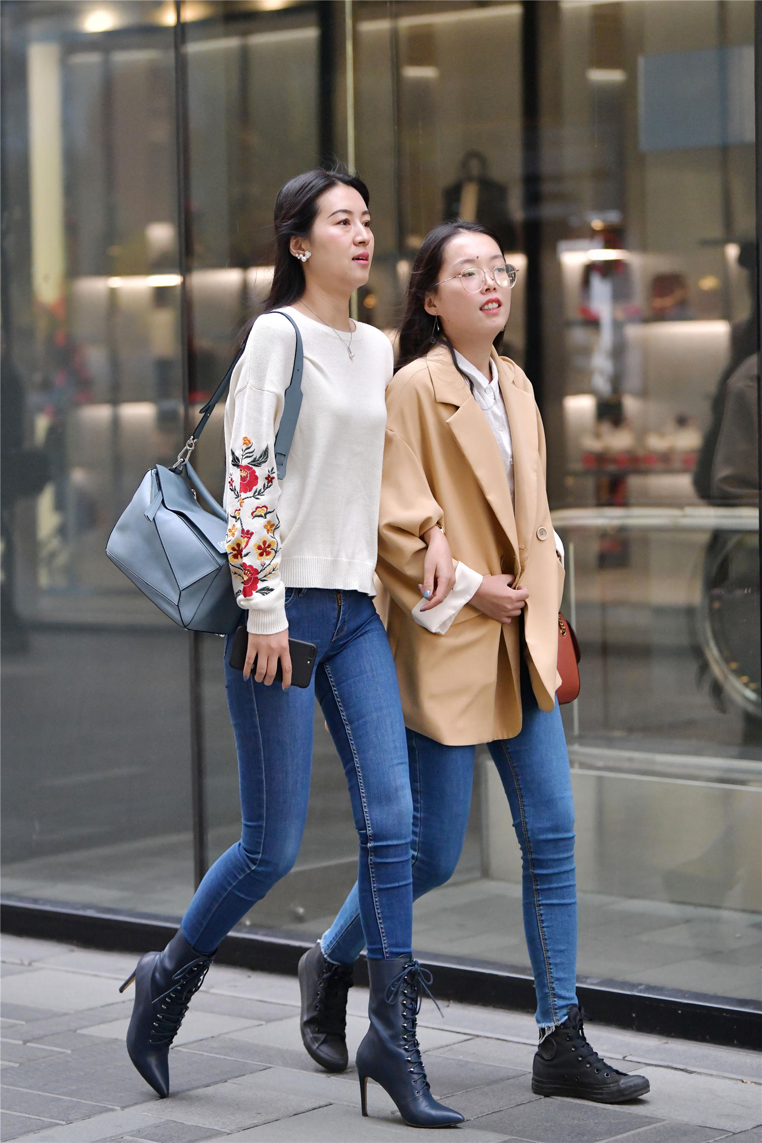 好看的修身牛仔裤,会穿出自信,到了秋天,还要搭配出秋天的味道,看一下这位美女的穿搭,一条深蓝色的修身牛仔裤,搭配一双尖头细跟系带短靴,8厘米左右的高度,更好的衬托她的身材,而且深蓝色的款式,这样和牛仔裤的色彩相近,一件白色的针织衫,袖口处有着刺绣的设计,增加一点色彩,她身边的闺蜜也是搭配修身牛仔裤,可以看出来,还是穿着高跟鞋会更显身材,当然穿高跟鞋会很累。