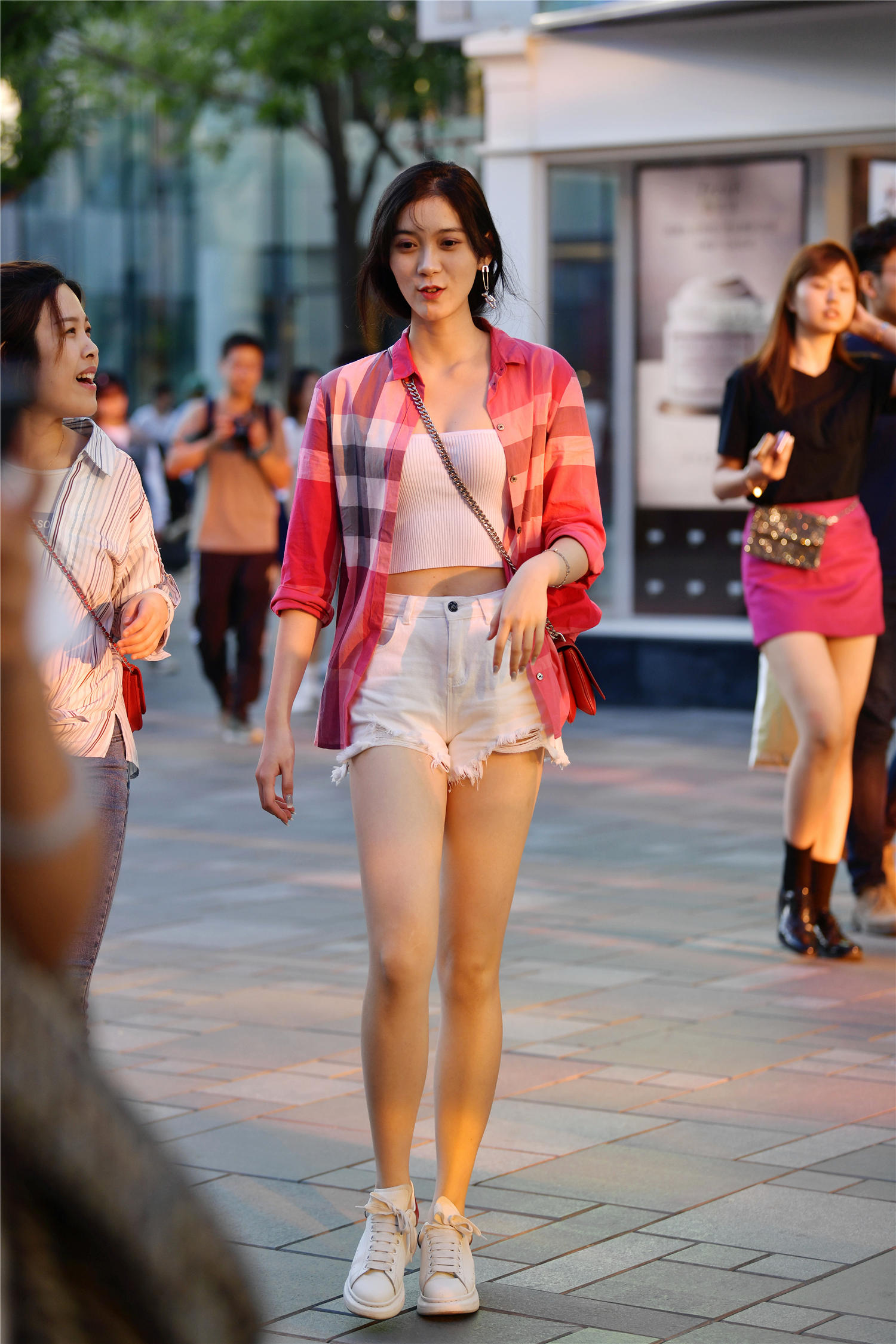 在时尚街区的姑娘,总会穿出自己的味道来,很好的展现出自己的风格,看一下这位美女的穿搭,白色毛面的牛仔短裤,搭配一件米色的抹胸,露出一点腰线位置,这样很好的衬托她的身材,外面一件粉色格子的衬衫,当作开衫来穿,有着休闲的效果,脚下穿着一双运动鞋,有着小女生的搭配效果。
