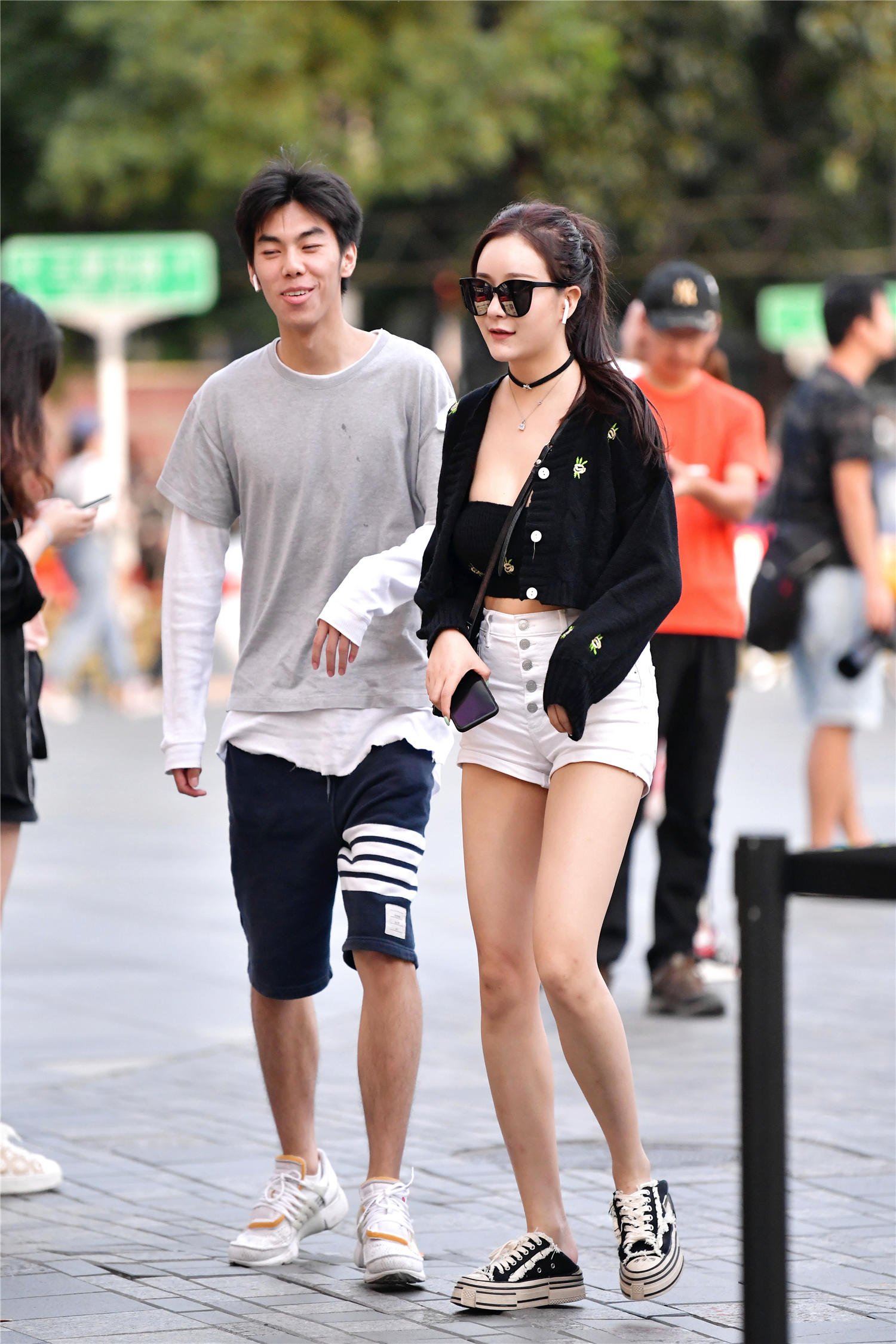 在秋天,也会有很多姑娘搭配短裤出行,虽然看起来会有点冷,但是她们依旧喜欢这样的穿搭,看一下这位美女的搭配,一条白色牛仔短裤,前面的扣子,增加层次感,修身的款式,也更好突出她的身材曲线,一件黑色抹胸外面一件短衣襟的夹克,这样有着深浅色的对比搭配,脚下穿着一双帆布鞋,有点脏脏的感觉,很多女孩子喜欢这样的设计。