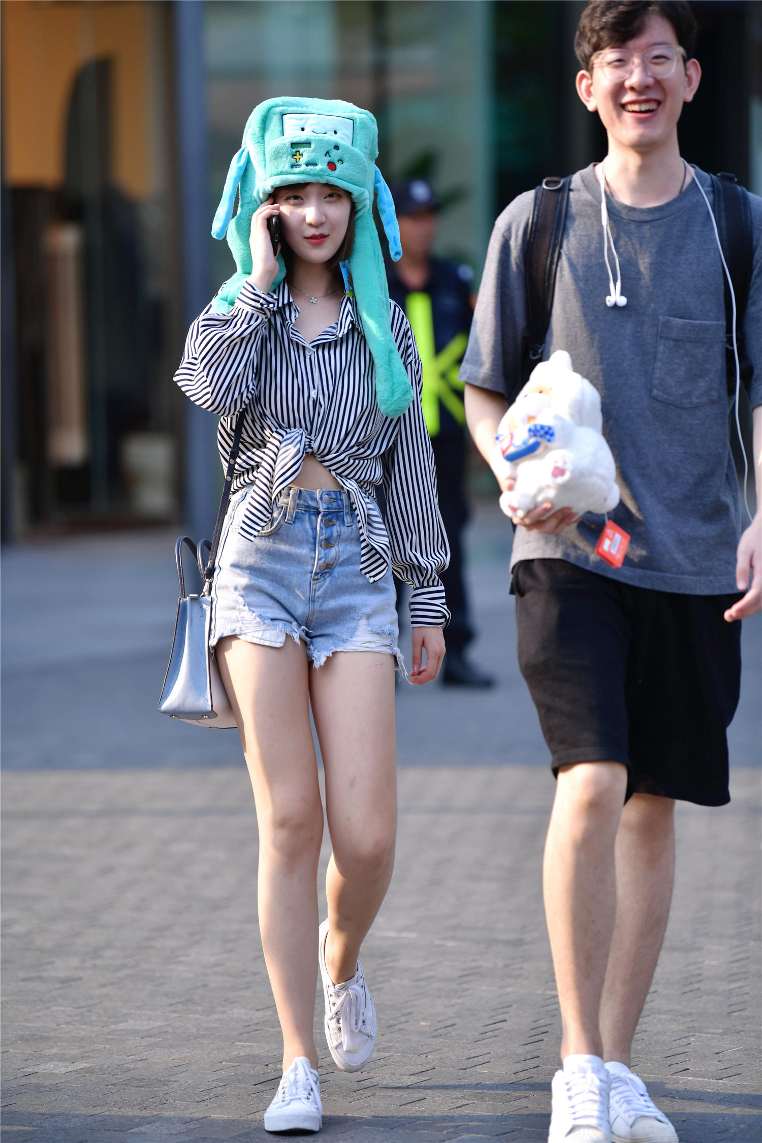 很多小女生的搭配,会变得简单很多,而且也会有很多好看的穿搭方法,看一下这位小姐姐的搭配,一条高腰的毛边牛仔短裤,搭配一件竖条格的衬衫,只系了两个扣子,衣角简单的系一下,显得非常个性,头顶上的个性帽子,非常好看,卡通图案的设计,显得人非常可爱,也有着显年轻的效果。