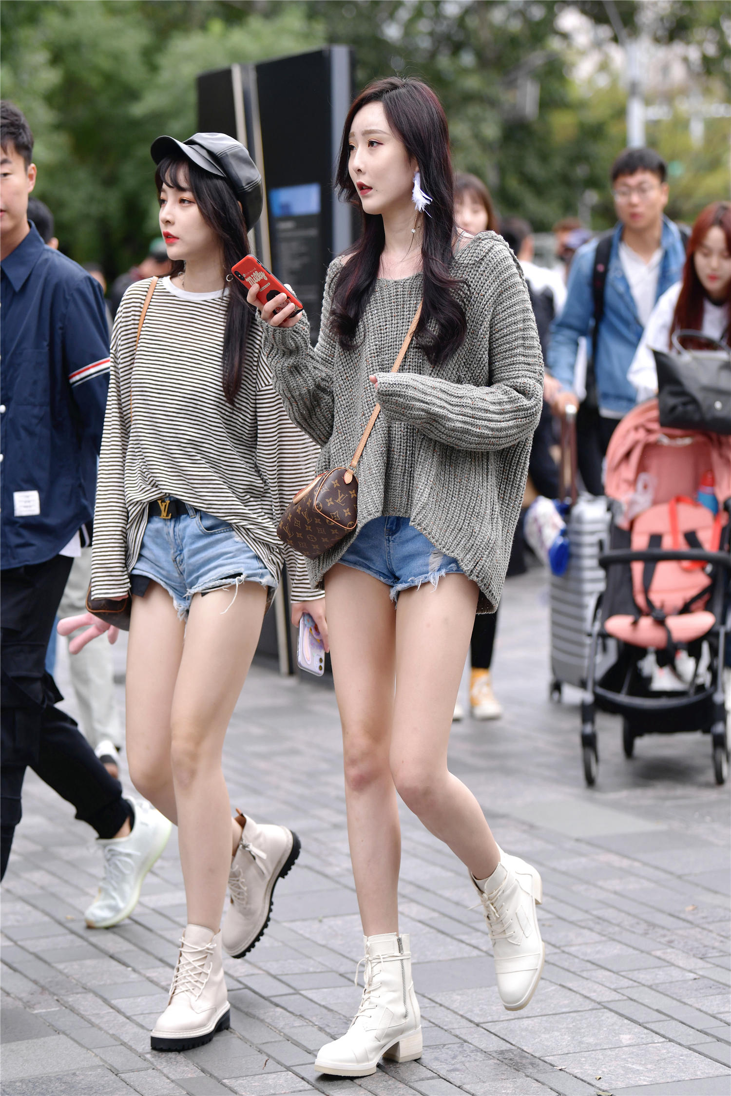 如果和闺蜜逛街,搭配出一点相似的风格,会很有意思,现在就看一下这一对姐妹,她们都搭配牛仔短裤,毛边的款式,却又不完全一样,一位穿着针织毛衣,衣摆的不规则设计,刚好露出牛仔短裤,搭配一双米色的系带短靴,很个性,她的姐妹是牛仔短裤搭配长袖横条纹小衫,前面的衣襟掖在短裤里面,这样展现自己,很有意思,脚下一双米色的短靴,她们的搭配是不是很相似,却又各自展现自己的风格呢?