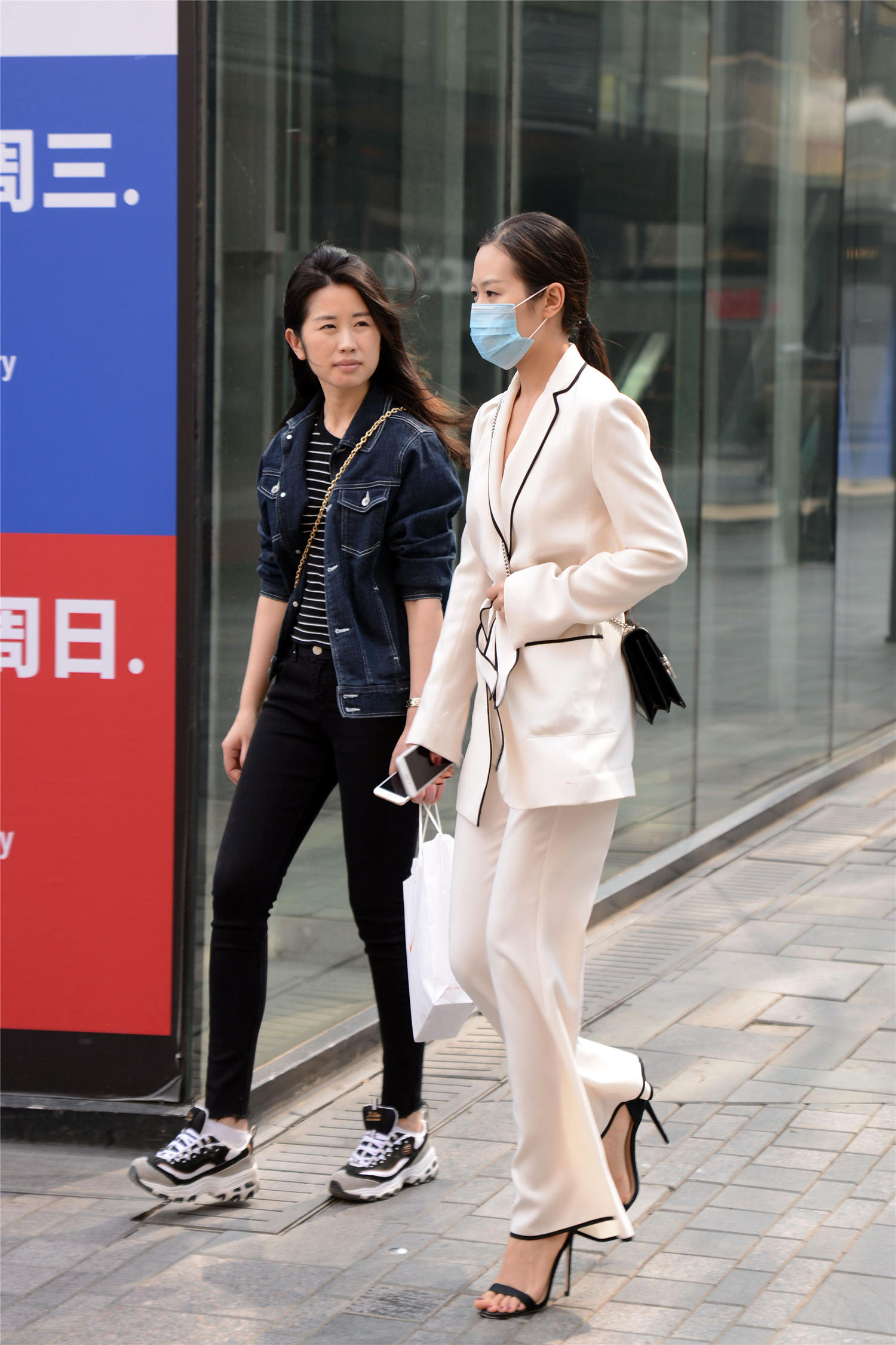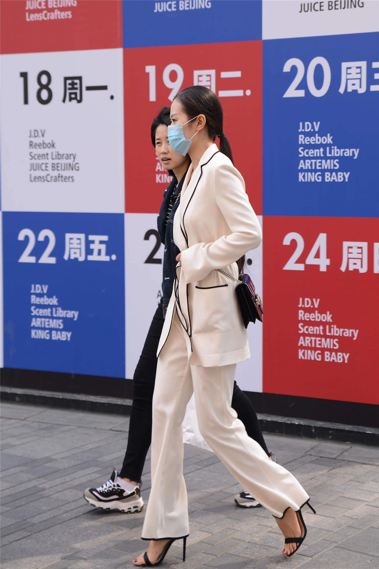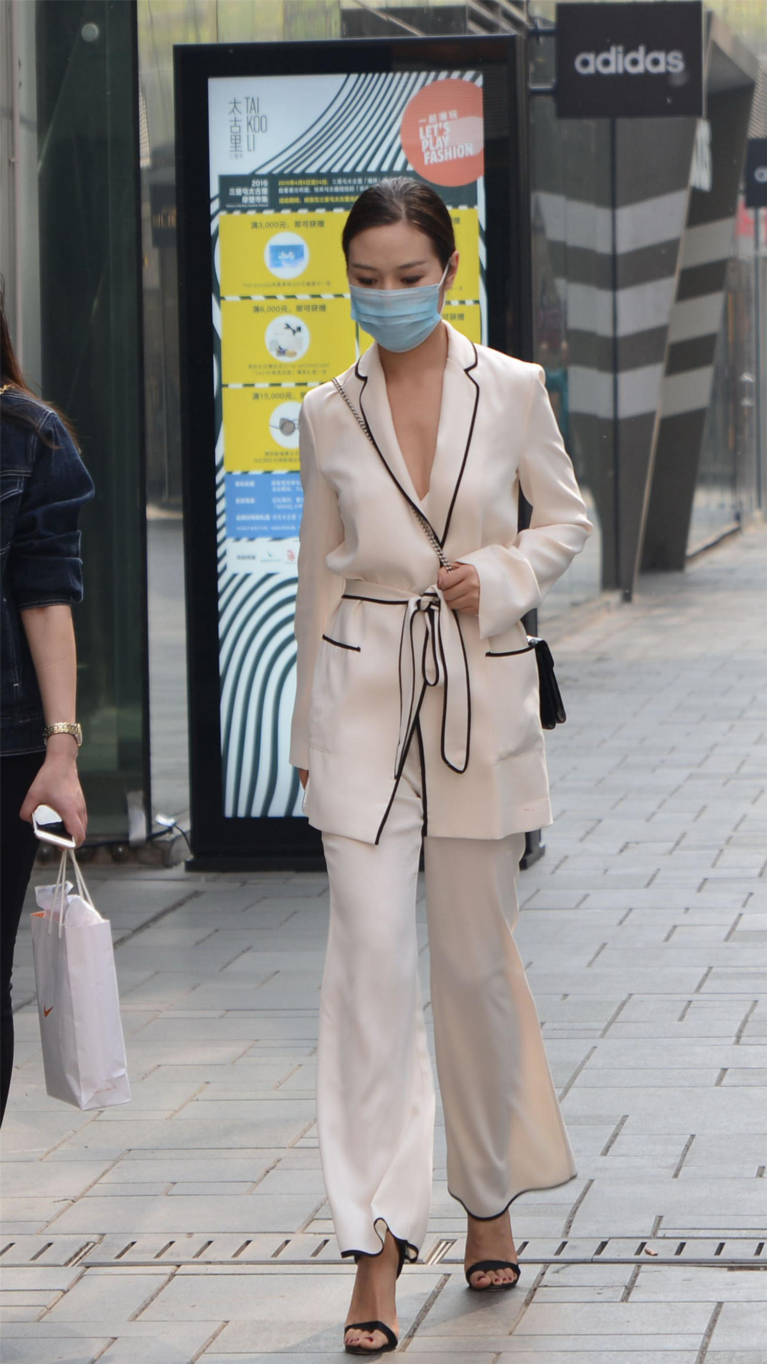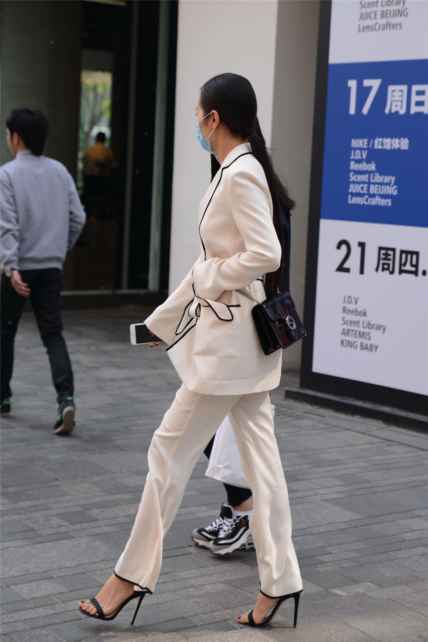 米白色套装,搭配一字带细高跟凉鞋,优雅时尚大气端庄