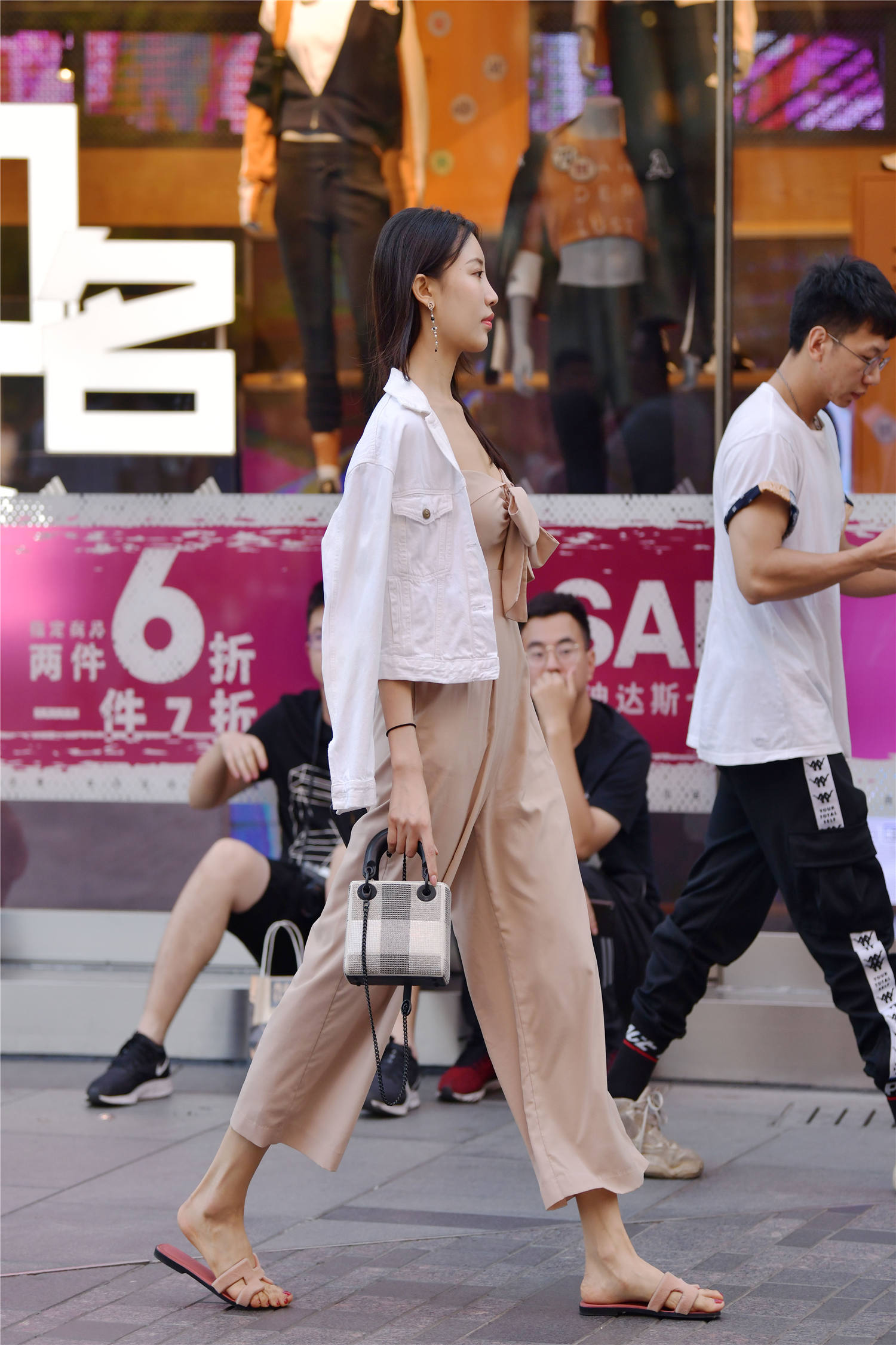 每一位时尚姑娘选择的长裤也会不一样,展现出来的气质,也会有所差别,连衣裤是很好的装束,虽然穿搭的人不多,却很好的展现气质美,这位美女选择一款杏色的连衣裤,抹胸的款式,前面一个漂亮的蝴蝶结,增加层次还漂亮,外面披着一件白色短衣襟的小衫,简单大气,还个性十足脚下一双H凉鞋,非常休闲的搭配。