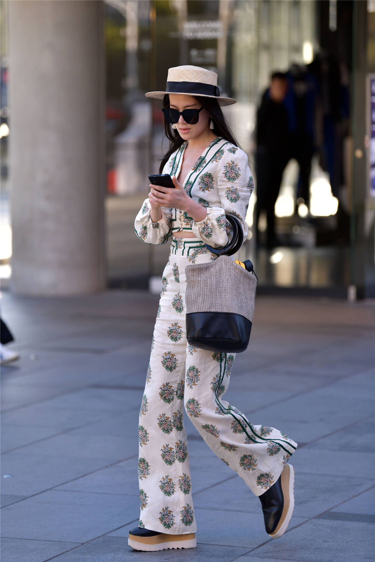 秋天要搭配出自己的味道,展示出自己的时尚效果,每个时尚姑娘选择的服装不同,搭配出来的效果也会千差万别看一下这位小姐姐的搭配,白色底面,上面的绿色印花,团团簇簇的,均匀分布,非常漂亮,这样一身套装,简单大气,搭配也非常漂亮,一顶礼帽搭配一下,非常精致的感觉,厚底的款式显出小女生的感觉。