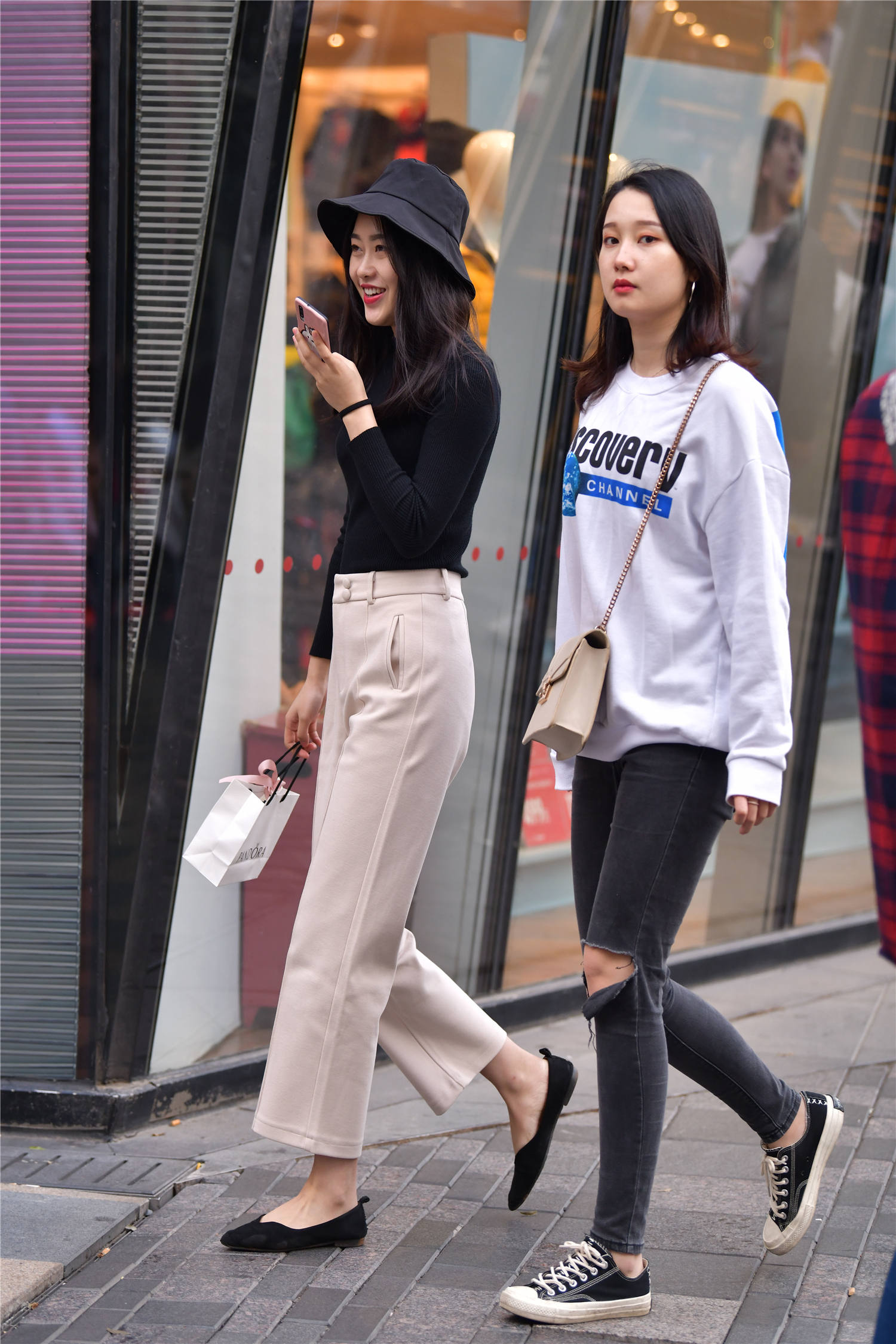 有人喜欢一个人逛街,有人喜欢约着自己的姐妹,秋天要搭配出自己的感觉,长裤的搭配简单容易,而且也会穿出很精致的感觉,看一下这一对姐妹的搭配,一位选择米色的长裤,九分裤脚露出脚踝和黑色的平底鞋,黑色长袖小衫,一顶黑色渔夫帽,简单大气,她的姐妹是深灰色牛仔裤,带着一个破洞,搭配白色卫衣,非常保暖的秋季搭配。
