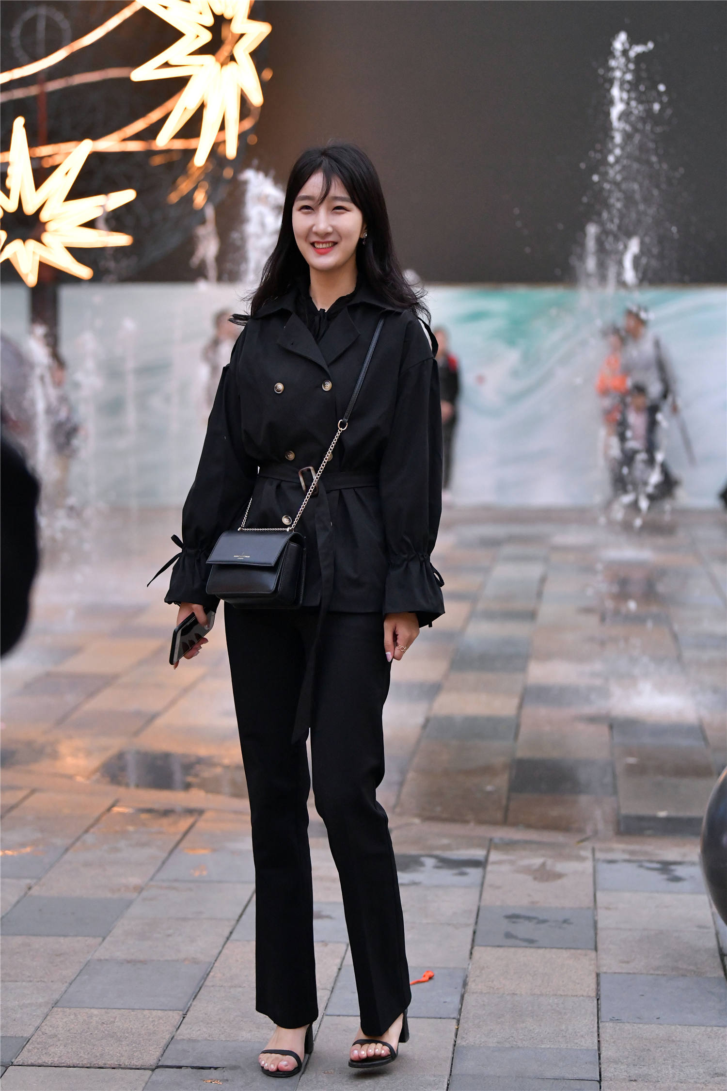 很多爱拍照的姑娘,她们搭配也很好看,站在那里就很美的感觉,看一下这位姑娘的穿搭,一身黑色搭配,上衣有着短款风衣的效果,裤子是一条黑色西裤,这一身搭配更像是套装,脚下穿着一双一字带粗跟凉鞋,秋天这样搭配,也很有意境,让人感觉冷暖均有的效果,穿出不一样的效果来。