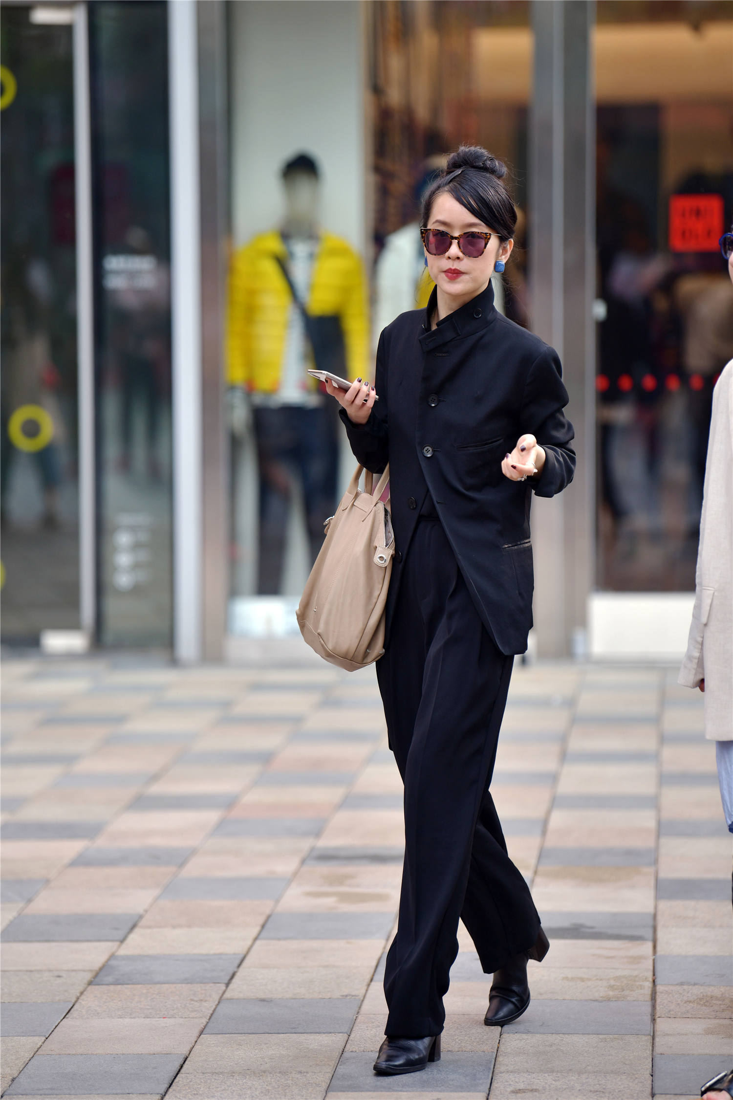 很多人喜欢黑色搭配,要搭配出气质才会展示出自己的味道,现在看一下这位黑色搭配的姑娘,黑色西服,立领的设计,简单大气,让人看着很古典的效果,搭配一条黑色西裤,显得更加大气一些,脚下的黑色粗跟鞋,系带的款式,这样有着更加正式的效果,姑娘为了表现自己,把头发盘起来,这样会更显精致的感觉。
