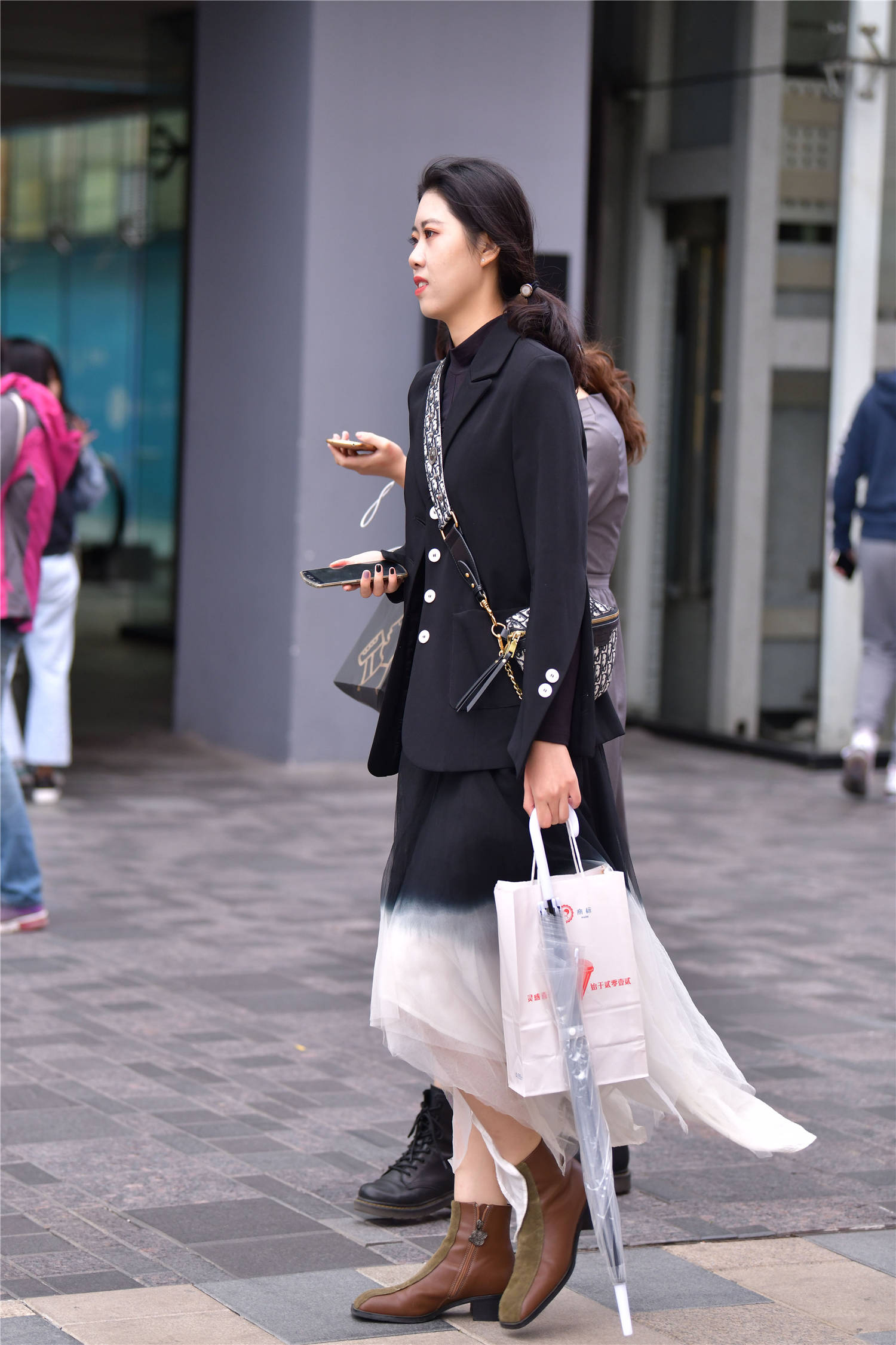 每个人喜欢搭配的短靴都不一样,所以也会穿出个性的效果,时尚搭配,不需要固定就这么搭配,很多人都是根据自己的喜好来搭配,这位美女选择一款黑白色的长裙,从黑色过渡到白色裙摆,有着纱裙的效果,裙摆到脚踝左右,被风吹起来,搭配一双棕色短靴,非常秀气的效果,上面搭配一件西服,秋天的搭配效果就出来了。