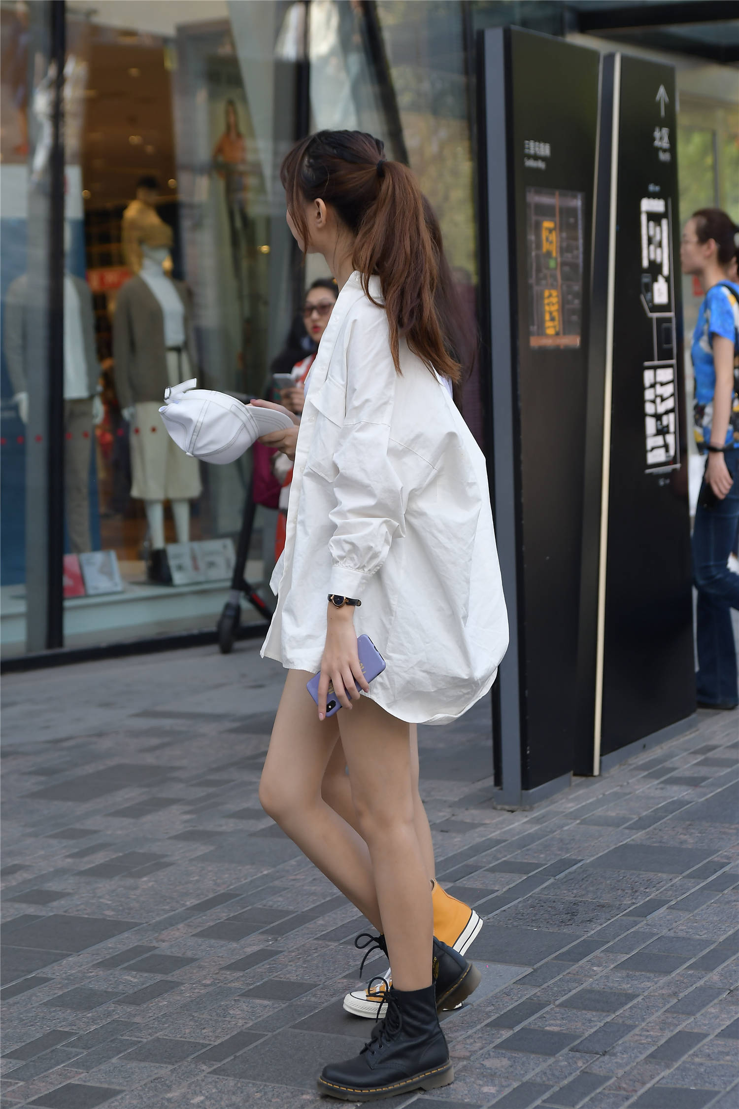 秋天的短靴款式也很多,每一位姑娘选择的也不一样,喜欢什么风格的都有,看一下这位姑娘,选择一款黑色马丁短靴,平底的款式,逛街会很舒服,搭配一件白色宽松的衬衫,现在很多女孩喜欢休闲款式很浓郁的衬衫,穿出来很宽松的感觉,有着像是穿着男朋友衬衫的感觉,也有着很精致的效果。
