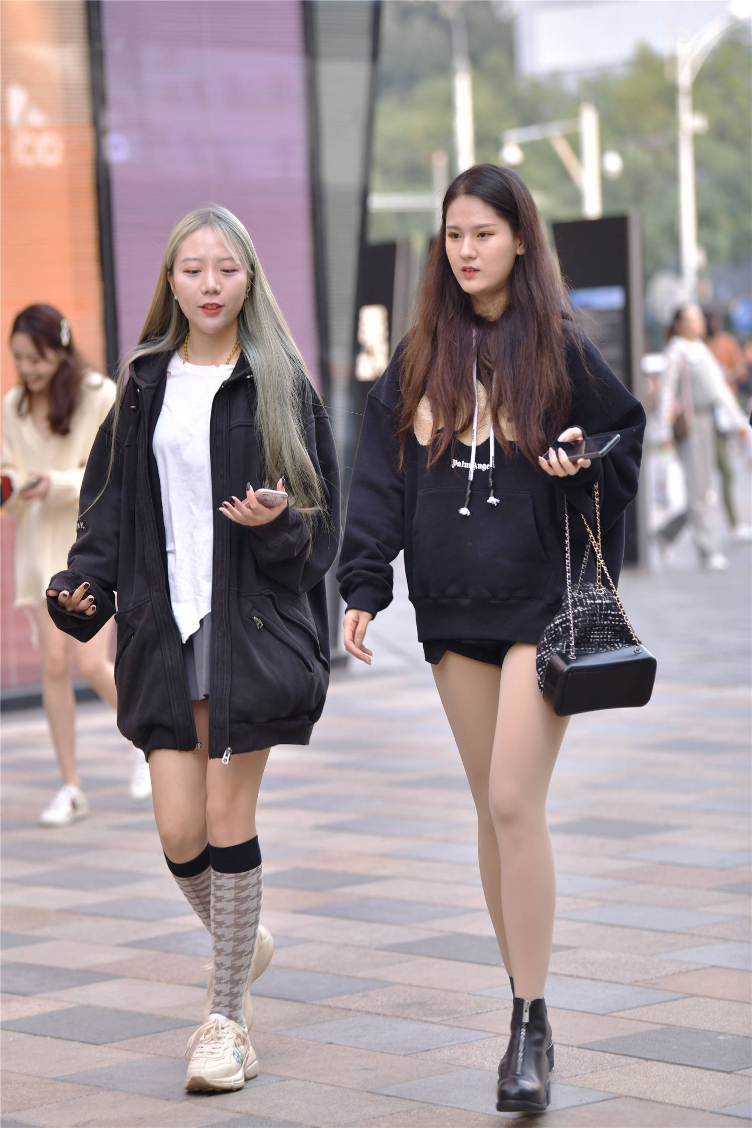 年轻的姑娘,喜欢搭配平底的短靴,而且也会穿出很美的效果,看一下这位姑娘,黑色搭配,很简单,一双黑色的拉链短靴,非常经典的款式,搭配黑色短裤和黑色卫衣,简单的穿搭,有着小女生的搭配感,她的闺蜜选择一款长衣襟的外套,内搭白色半袖和一条灰色的百褶裙,被她的外套遮住,高筒袜搭配运动鞋,有着小女生的搭配效果。