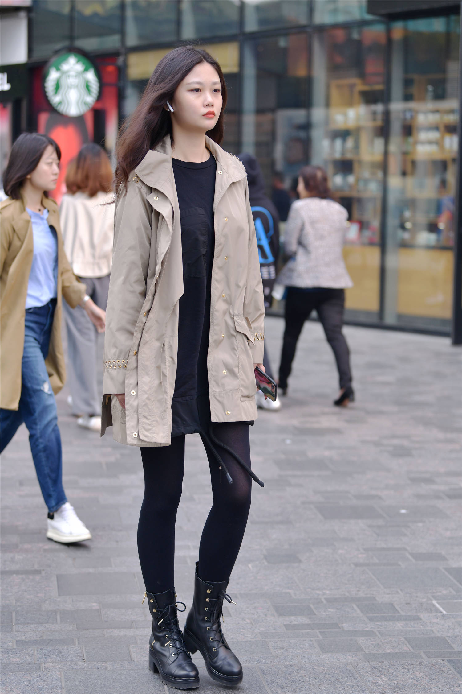 秋天的搭配,很多姑娘会注意保暖,而且选择黑色也多了起来,看一下这位小姐姐的穿搭,卡其色的外套,有点短款风衣的效果,扣子没有系上,这样会让你看到内搭,一件黑色连衣短裙,更像是长款的T恤,黑色修身打底裤,显瘦的同时,还有着很保暖的效果,到了秋冬季节,很多姑娘都喜欢搭配这款裤子,一双黑色皮质马丁短靴,这就是秋天的穿搭。