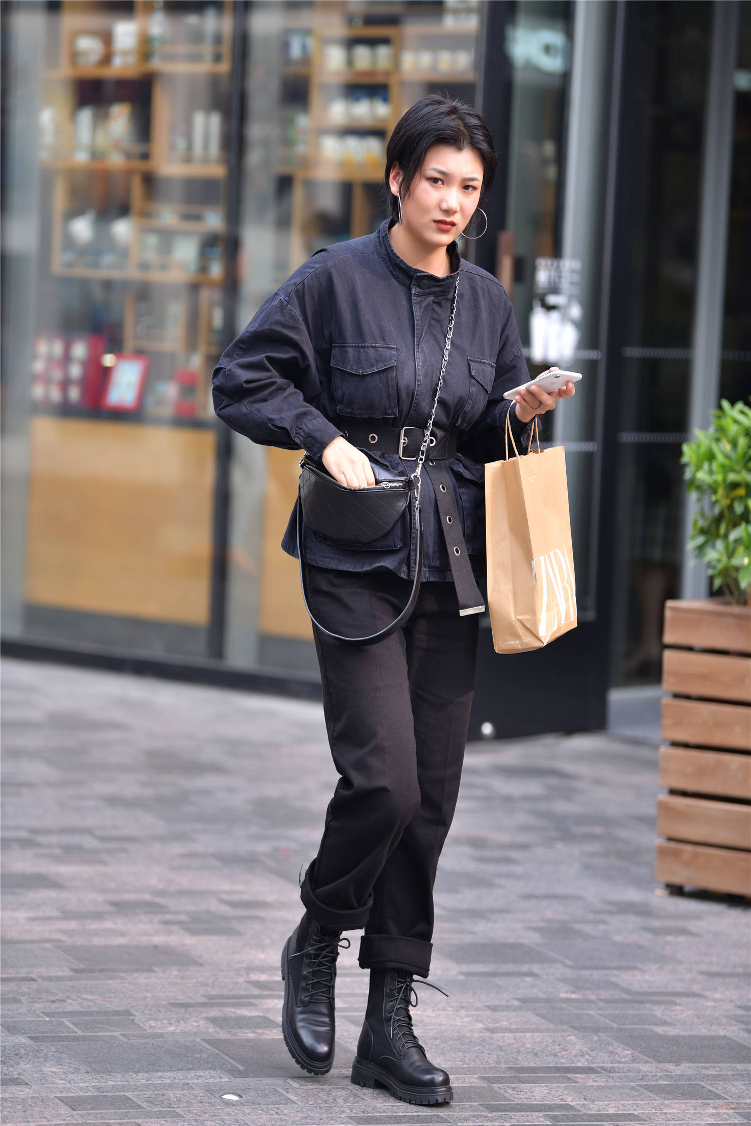 很多人喜欢黑色,而且还要搭配出一点不一样的质感才好,看一下这位美女选择的黑色搭配,黑色的外套,两侧的兜子设计,增加层次感,一条黑色针扣腰带,收腰效果很好,也展现身材比例,黑色的长裤,挽起裤腿,为了展示脚下的黑色皮质系带短靴,选择的黑色,都有着自己的特点,也很有层次,秋天要注意保暖。