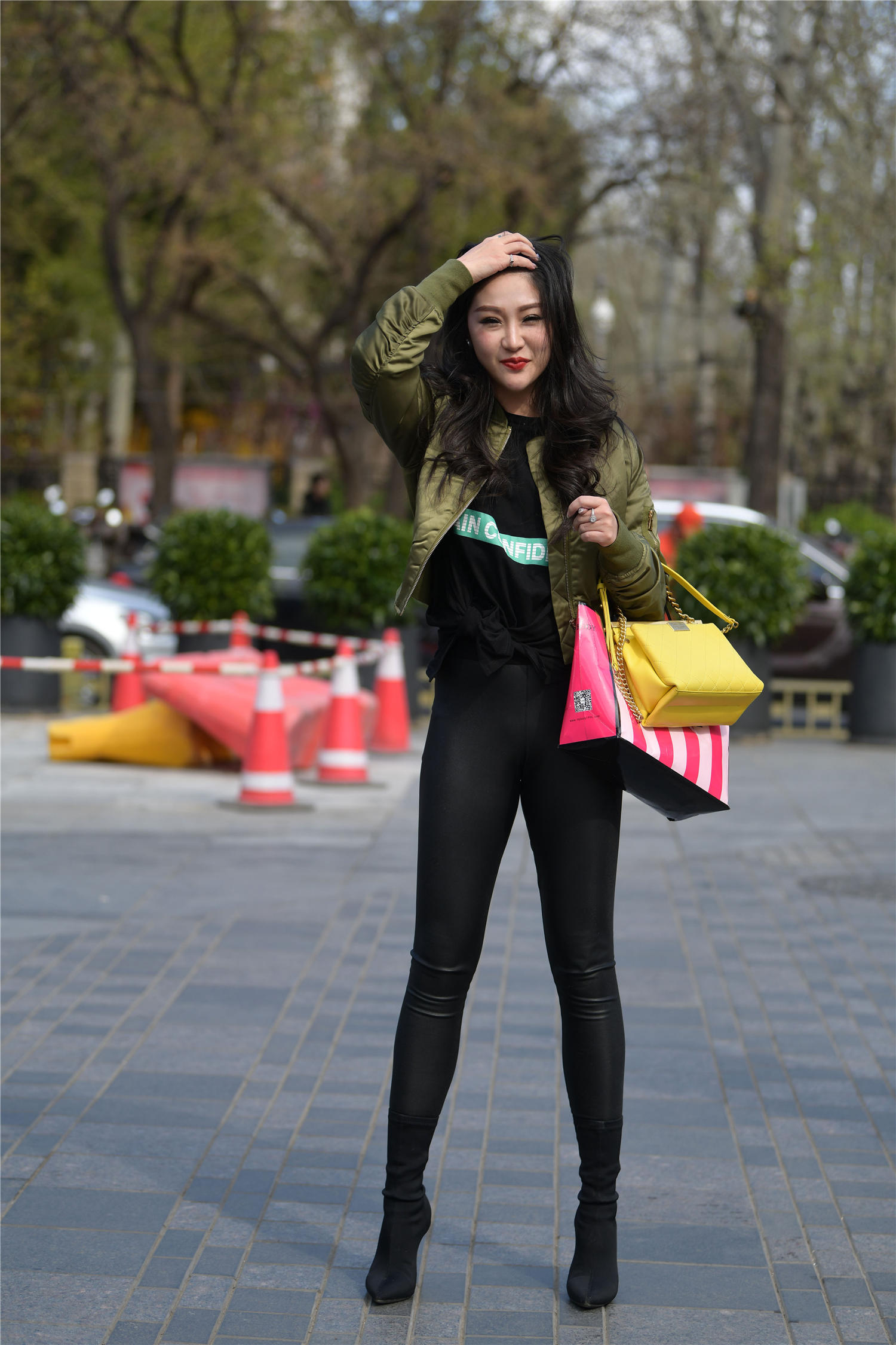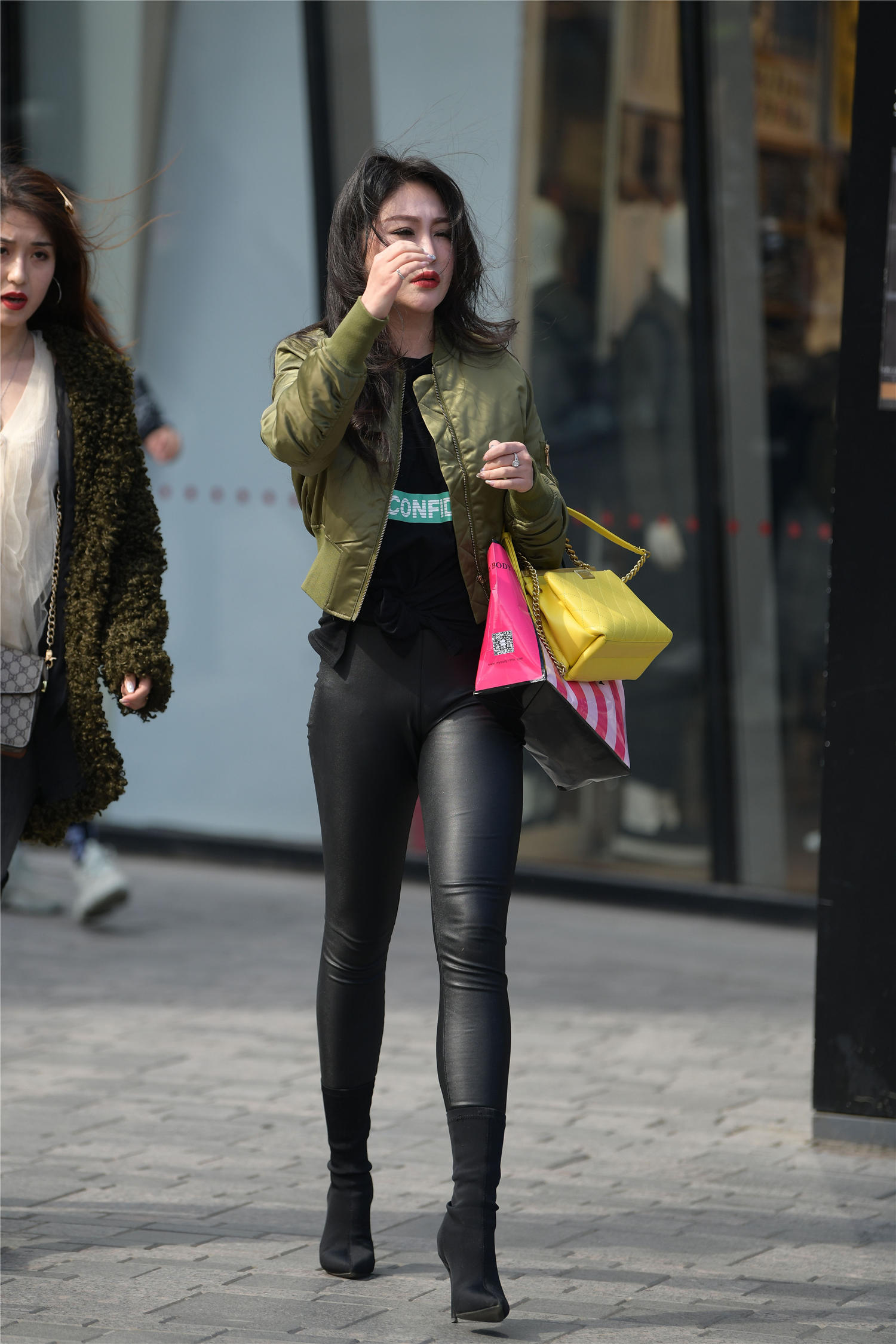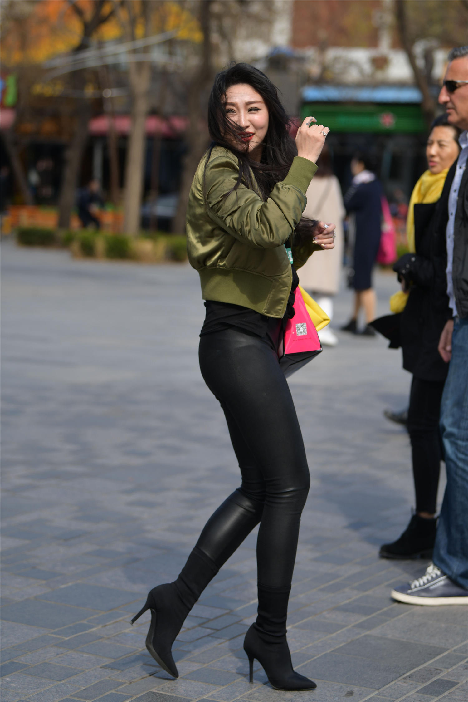 这位小姐姐选择一款黑色的皮裤,修身效果很好,也展现了姑娘的线条美,搭配一双尖头细跟短靴,这样身材显得高挑,简约的鞋型,搭配出简单的味道,其实高跟鞋要穿着走路时尚优雅,才会有着很好的效果,短靴与皮裤之间,不同的质感,让黑色搭配有了层次感觉。