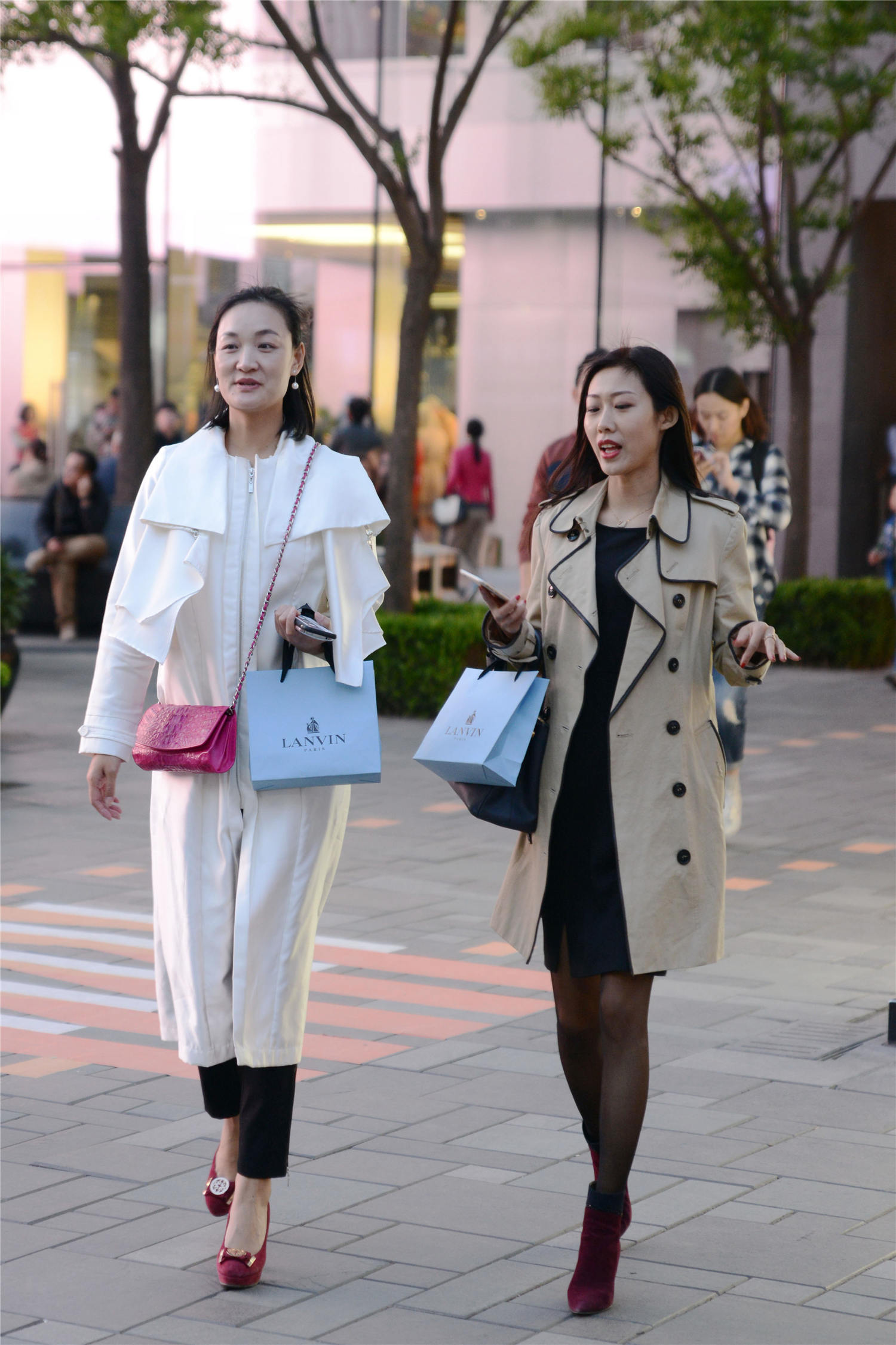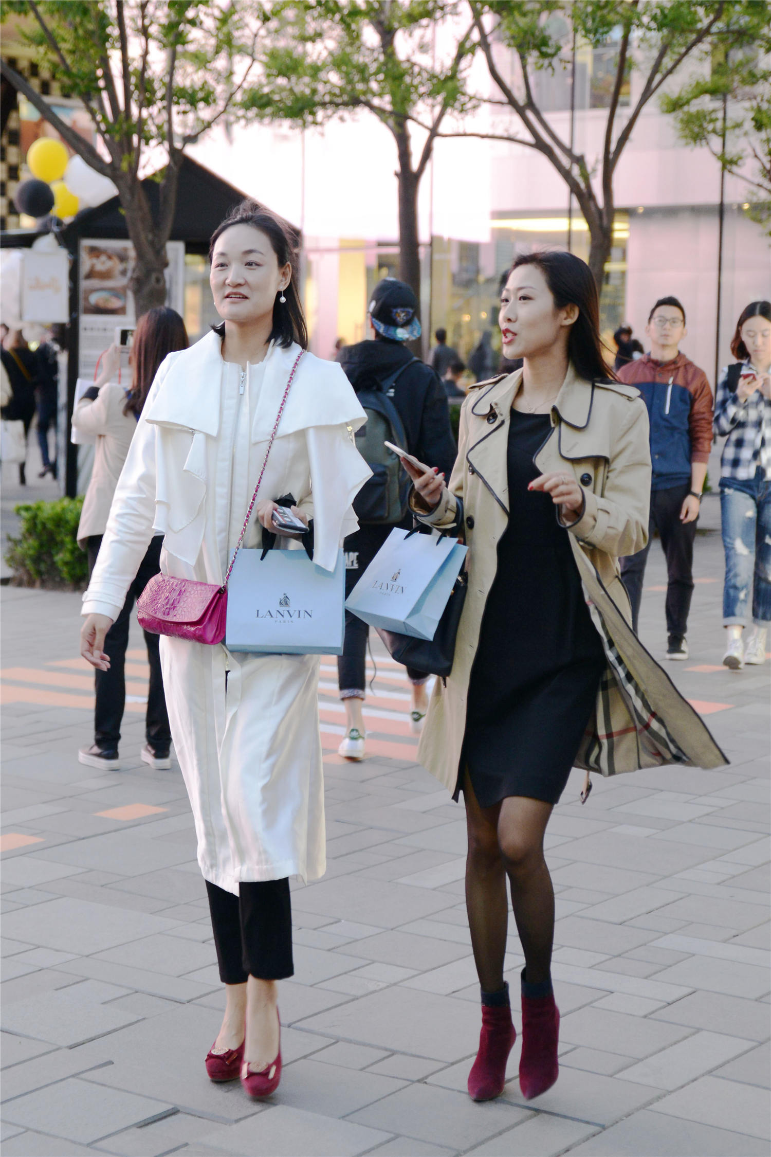 看一下这一对闺蜜的搭配,她们穿着风衣,却选择不同的款式,白色风衣,把拉链拉起来,下摆的开叉,衣襟前面的层次感,非常好看,九分的黑色长裤,脚下一双酒红色的高跟靴,浅口的色设计,粗跟走路会很平稳,也搭配出很精致的感觉,一个红色的单肩包,增加色彩感觉,穿出很精致的感觉。