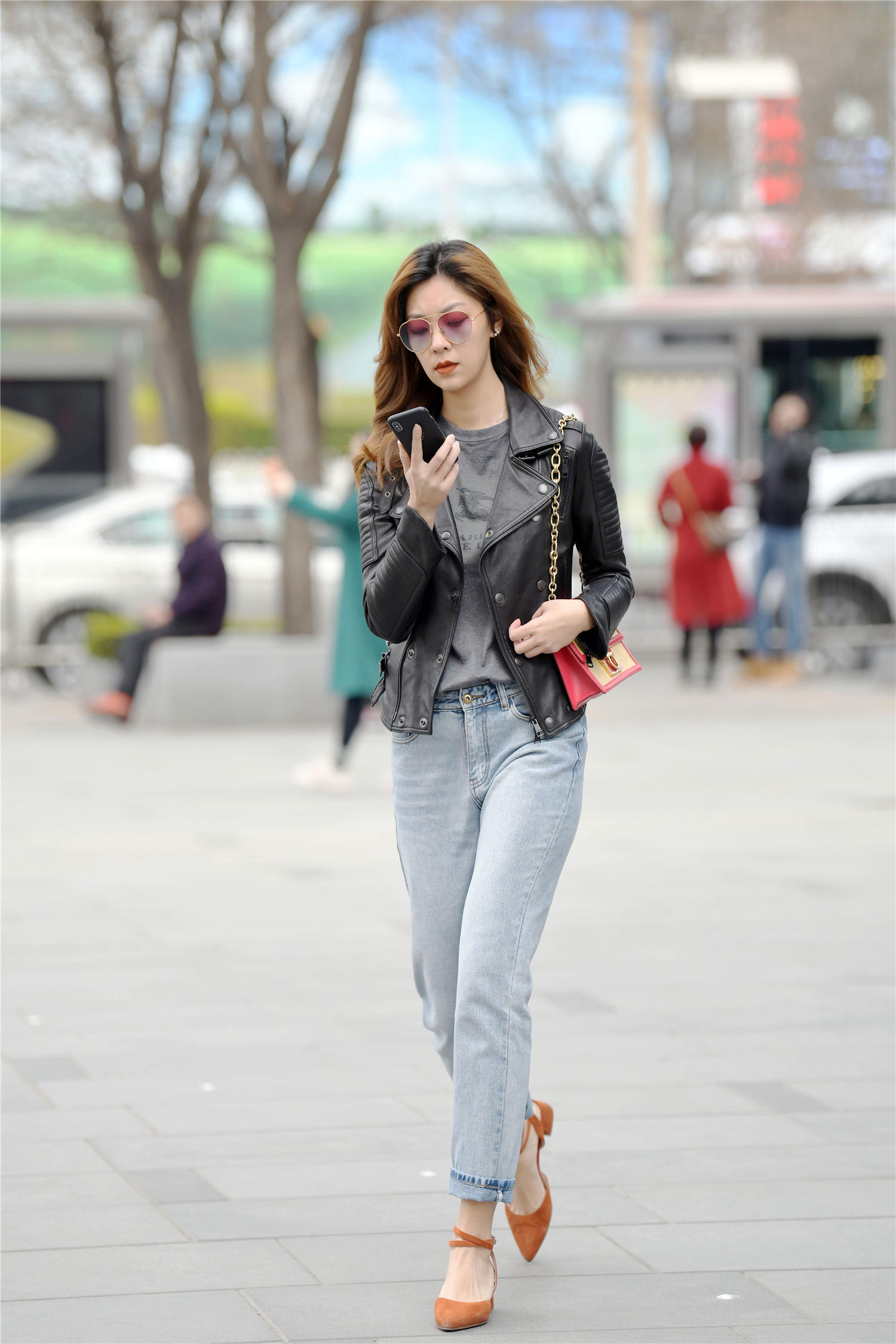 到了秋天,很多人喜欢搭配牛仔裤,牛仔裤的百搭效果,款式繁多,让你可以轻松搭配出自己想要的风格,那么你会选择什么款式的牛仔裤呢?看一下这位姑娘的搭配,一条浅蓝色的牛仔裤,不是修身的款式,却也不是很宽松,搭配一件浅灰色小衫,外面一件黑色皮夹克,增加层次感和色彩,脚下穿着一双尖头粗跟凉鞋,搭配出很显身材的效果。