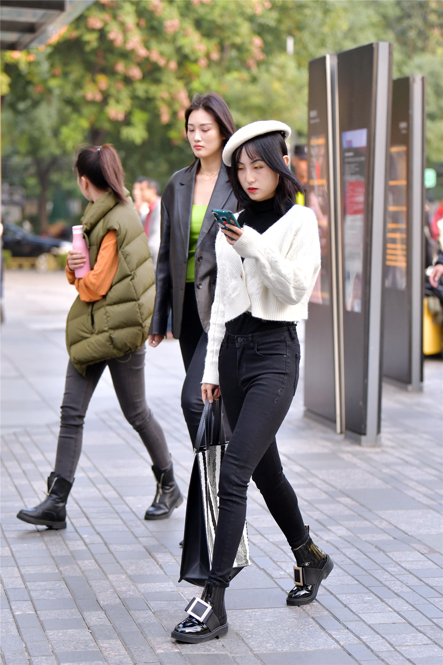 每一位秋季搭配牛仔裤的姑娘,有着自己的想法,也展现出不一样的时尚味道,这位美女选择一条黑色修身牛仔裤,高腰的款式,显瘦效果很好,一件白色针织小衫,短衣襟的款式,更好的展示身材比例,一双漆皮的平底短靴,更好的衬托她的精致,鞋面的方扣设计,很精致,一顶白色呢子贝雷帽,简单又很洋气。