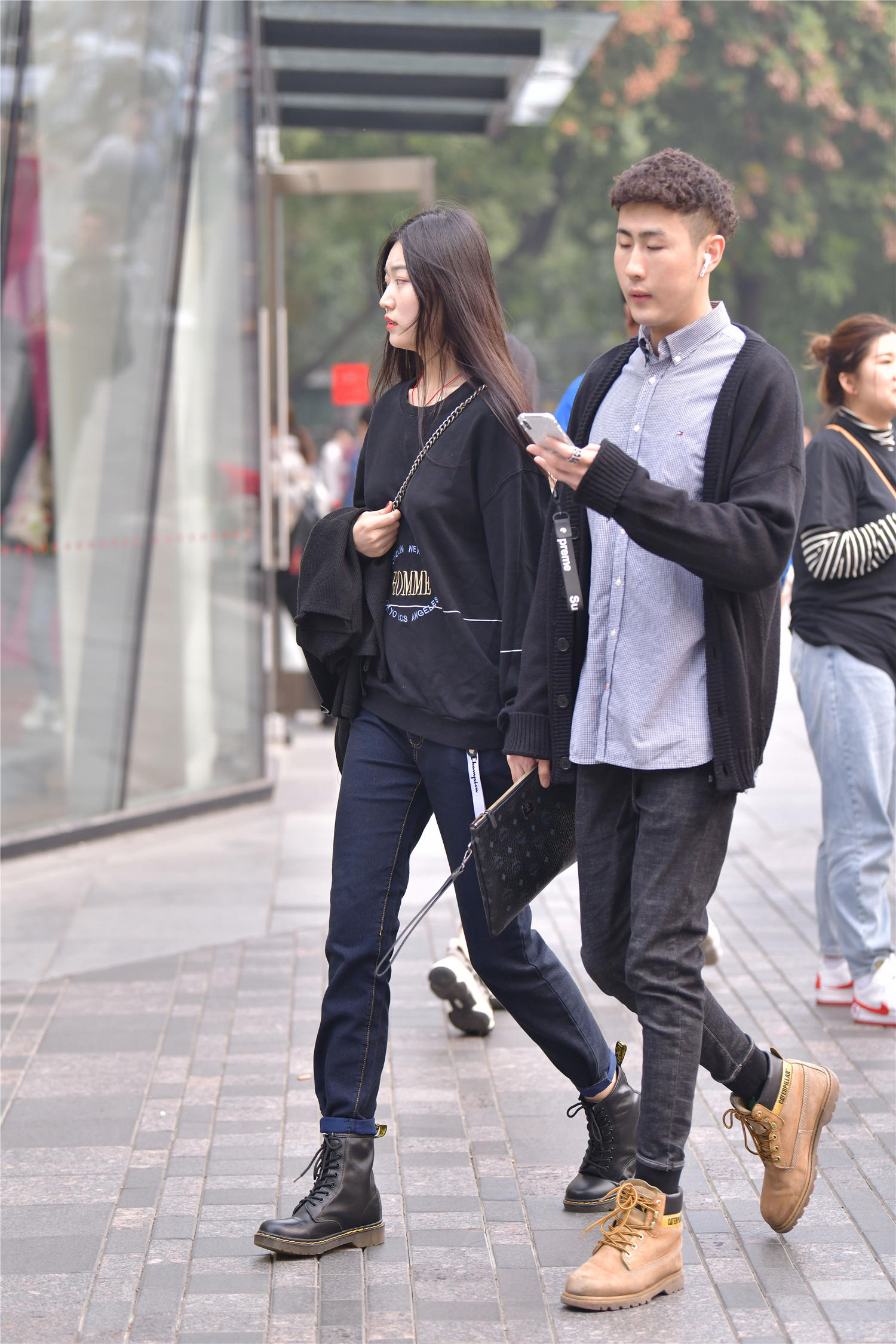 很多身材好高挑的姑娘,她们会搭配出很休闲的效果,穿着自己感觉很舒适的方式,这位美女选择一款略带宽松的深蓝色牛仔裤,很简单的设计,搭配一双马丁短靴,显得腿型笔直,一件黑色卫衣,臂弯里还搭着一件外套,出门逛街,也会注意保暖,而且深色系搭配,也有着一点层次的效果,是不是很好看呢?