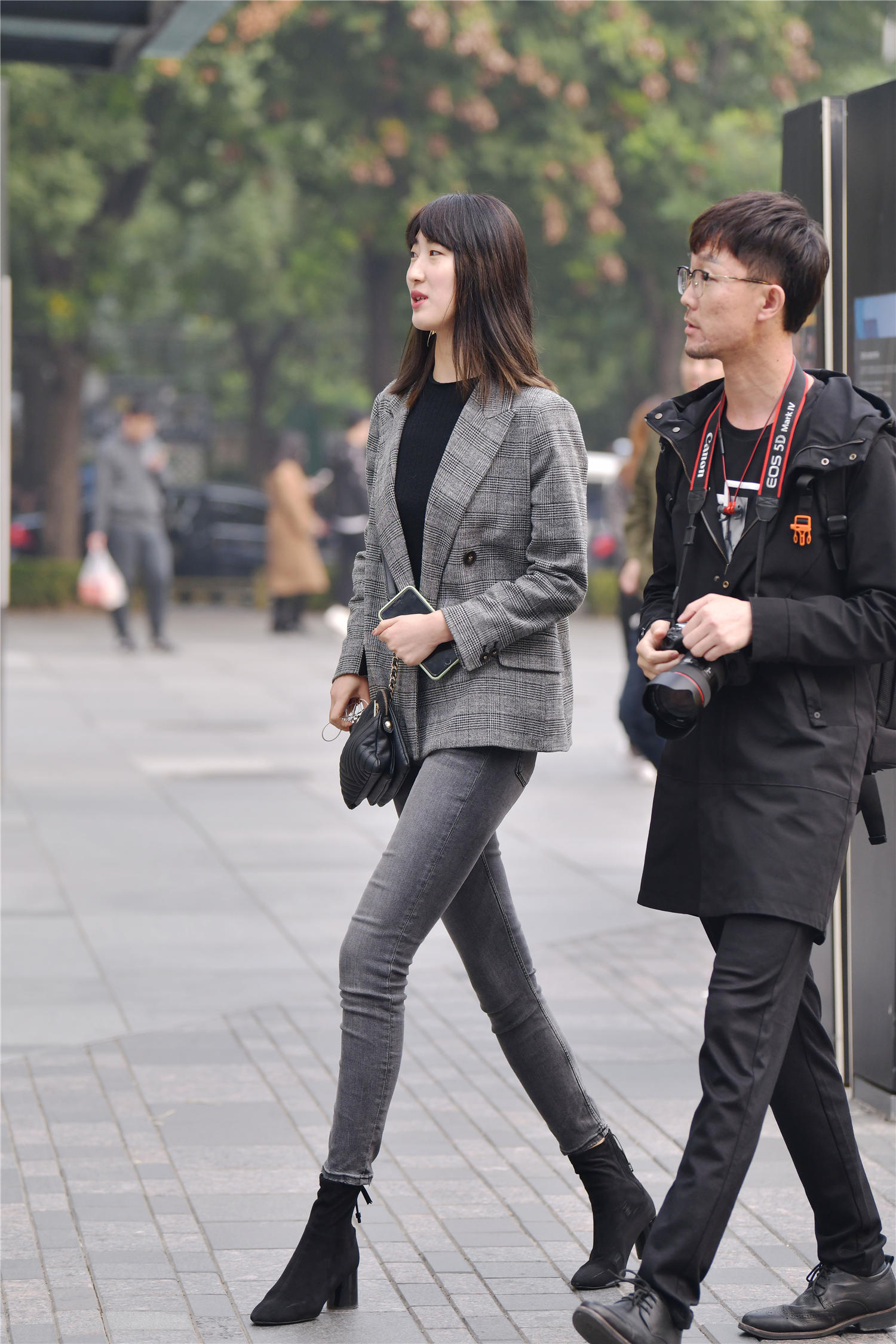 到了秋天,搭配上最要注意的就是保暖,从简约的风格入手,也要看流行趋势,会搭配出很个性的感觉,这位身材高挑,很骨感的姑娘,选择深灰色修身牛仔裤,搭配一双黑色粗跟短靴,牛仔裤的裤脚与短靴刚好相接,显得腿很长,搭配一件灰色格子西服,这是今年比较流行的搭配,看起来也很好看。
